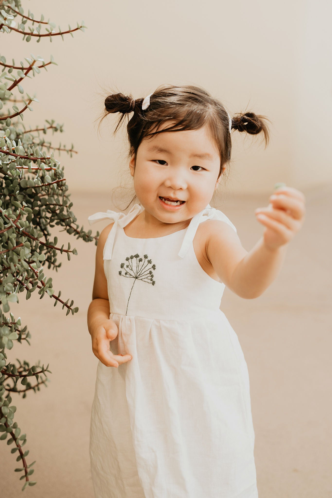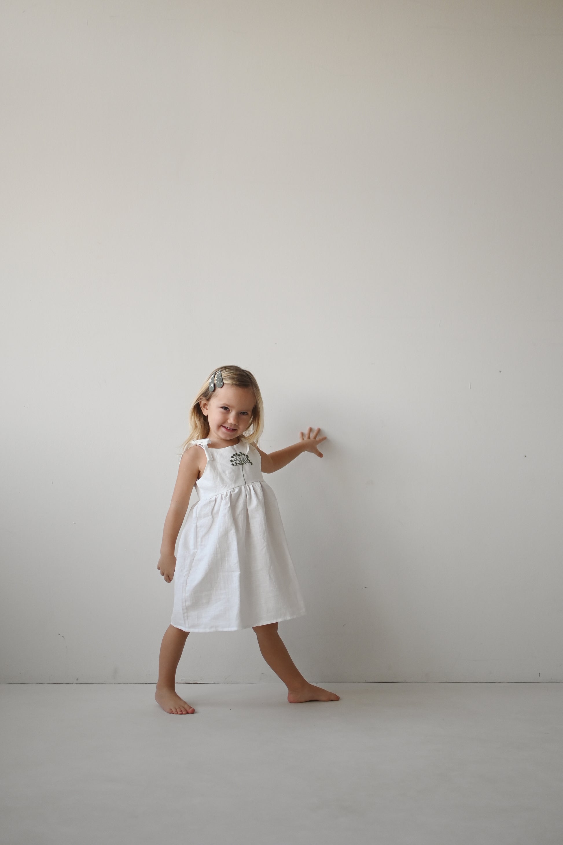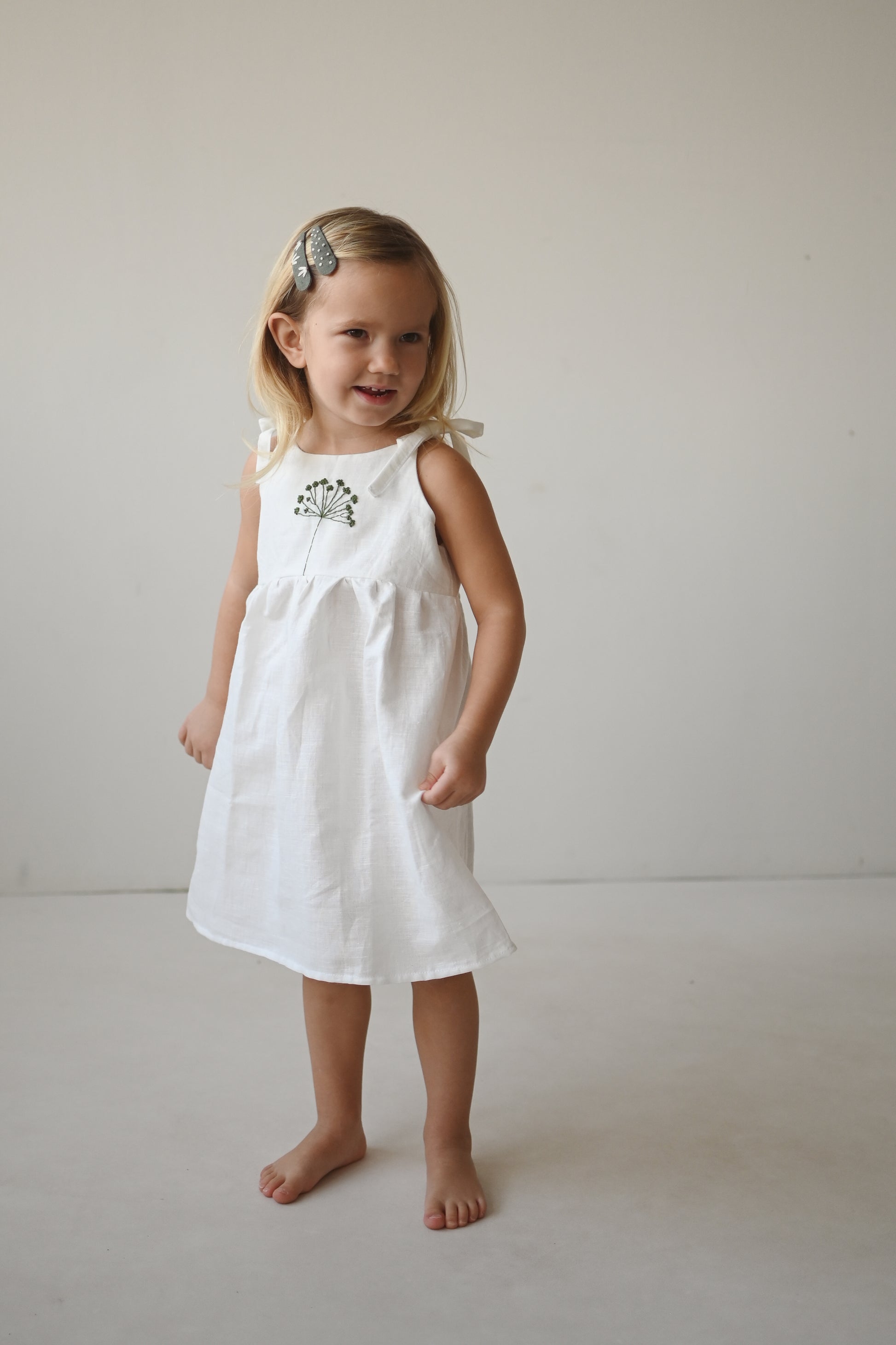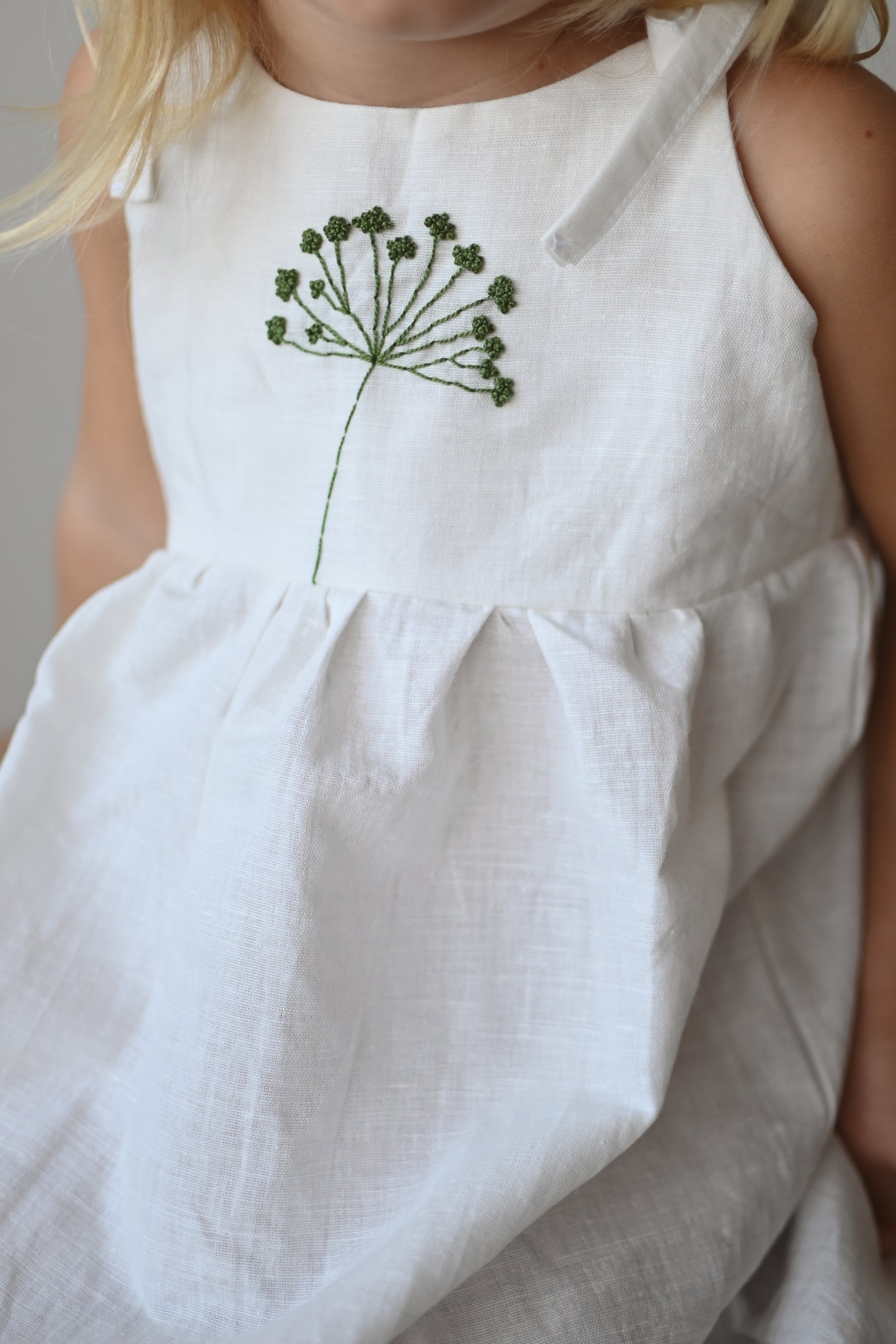 Oblekica je res mehka, saj je oblačilo predprano, da se v prihodnosti ne krči. Izdelano iz tkanine s certifikatom OEKO - TEX Standard 100. 51% lan in 49% bombaž. Vezenje je ročno izdelano in je dolgotrajen proces. Vsaka oblekica je drugačna in edinstvena. Skrbno narejena z veliko ljubezni.
