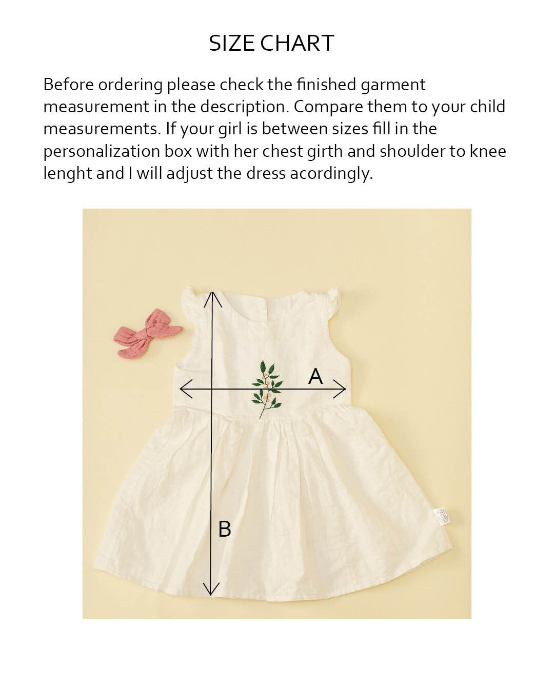 Choose the size by your kids age but check the finished garment measurements and compare them to your child measurements written bellow. If your girl is between sizes I can always shorten or lengthen the dress. I love working with exact measurements to assure better fit, if you are not sure just message me the following data: age, height, shoulder to knee length and chest girth measurement to my email: info@lanika-apparel.com.