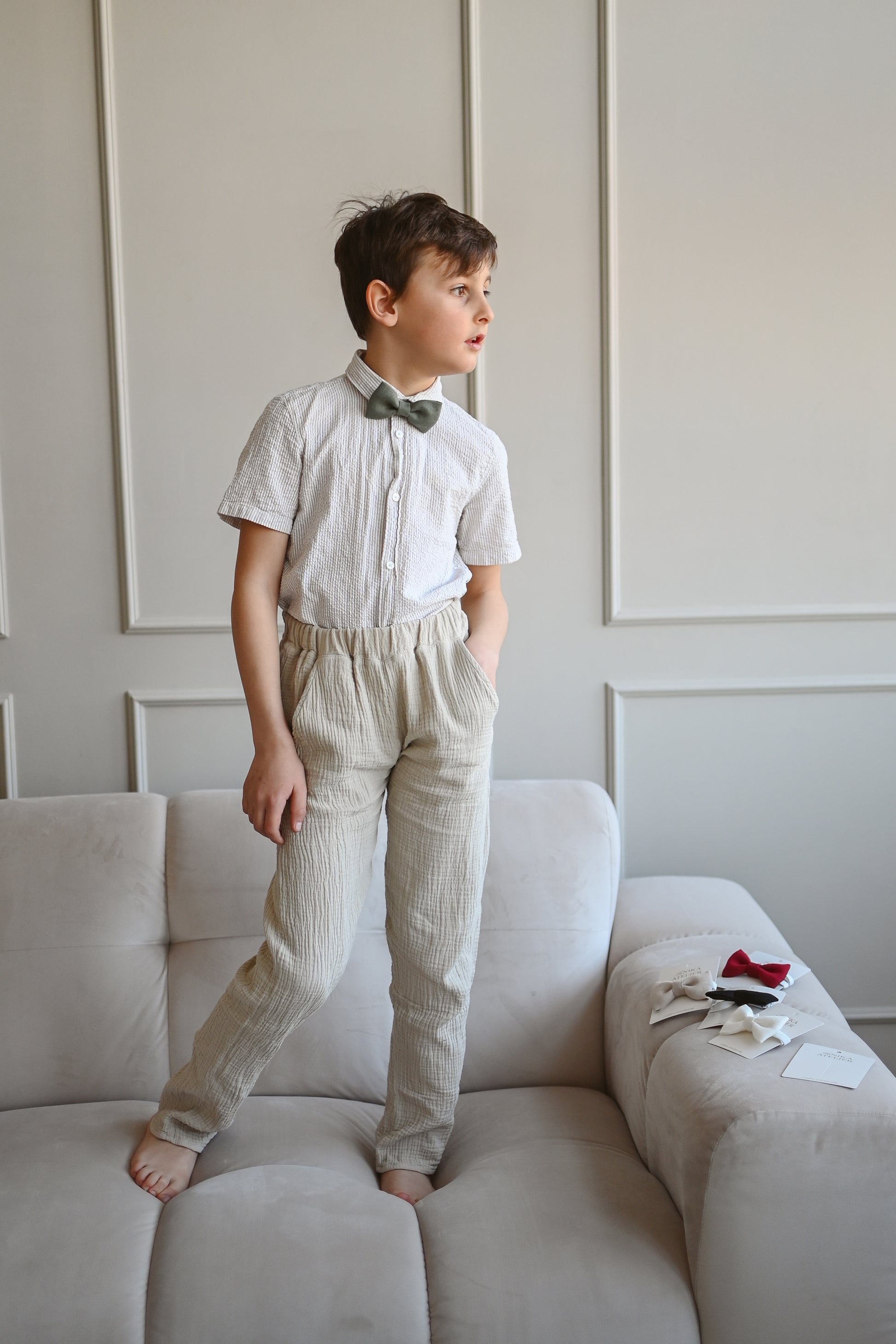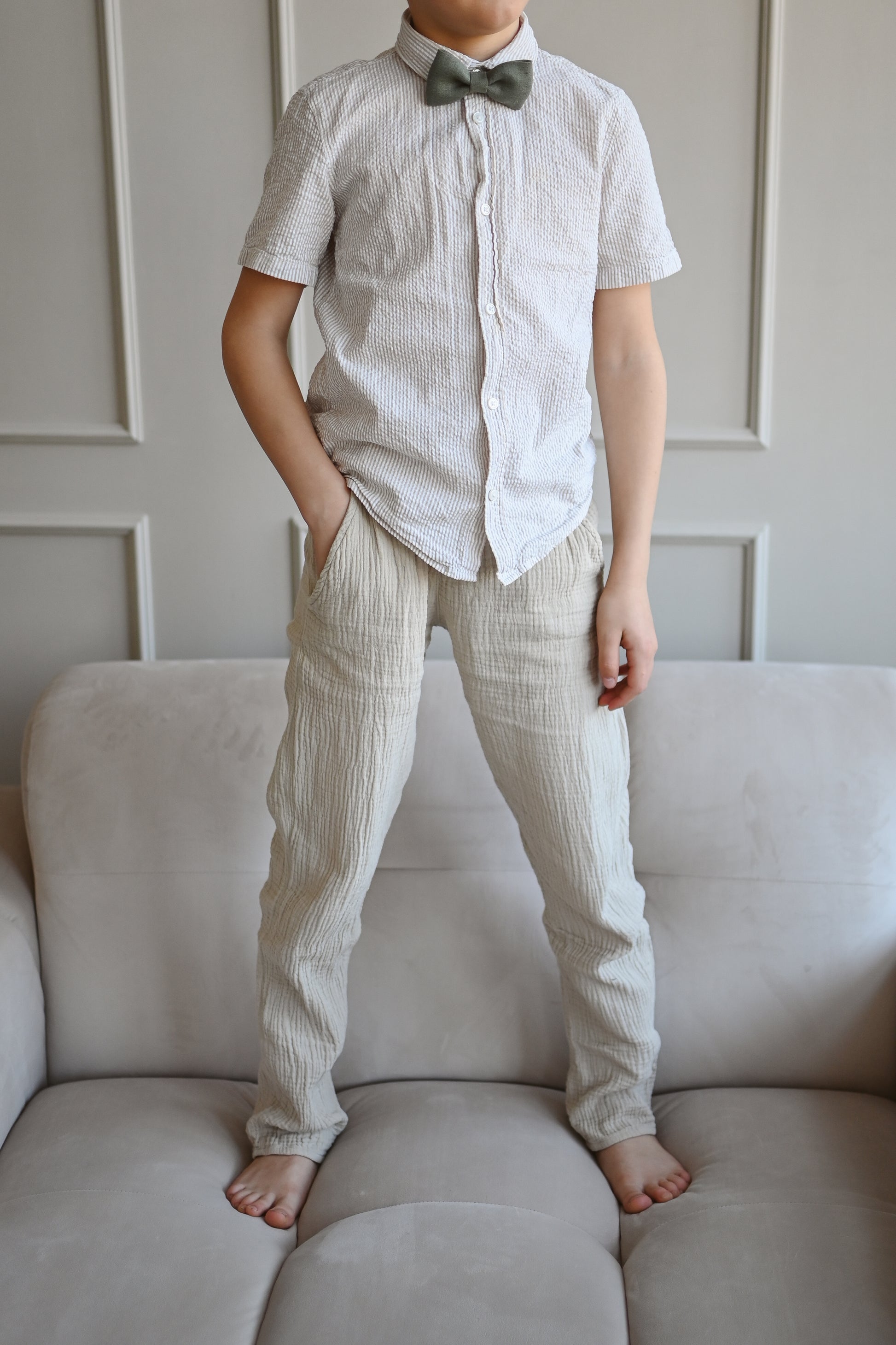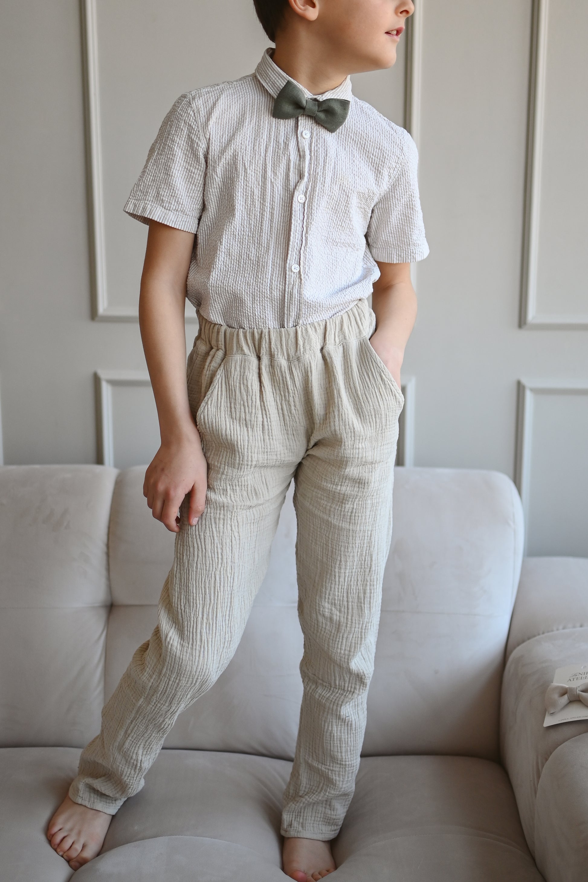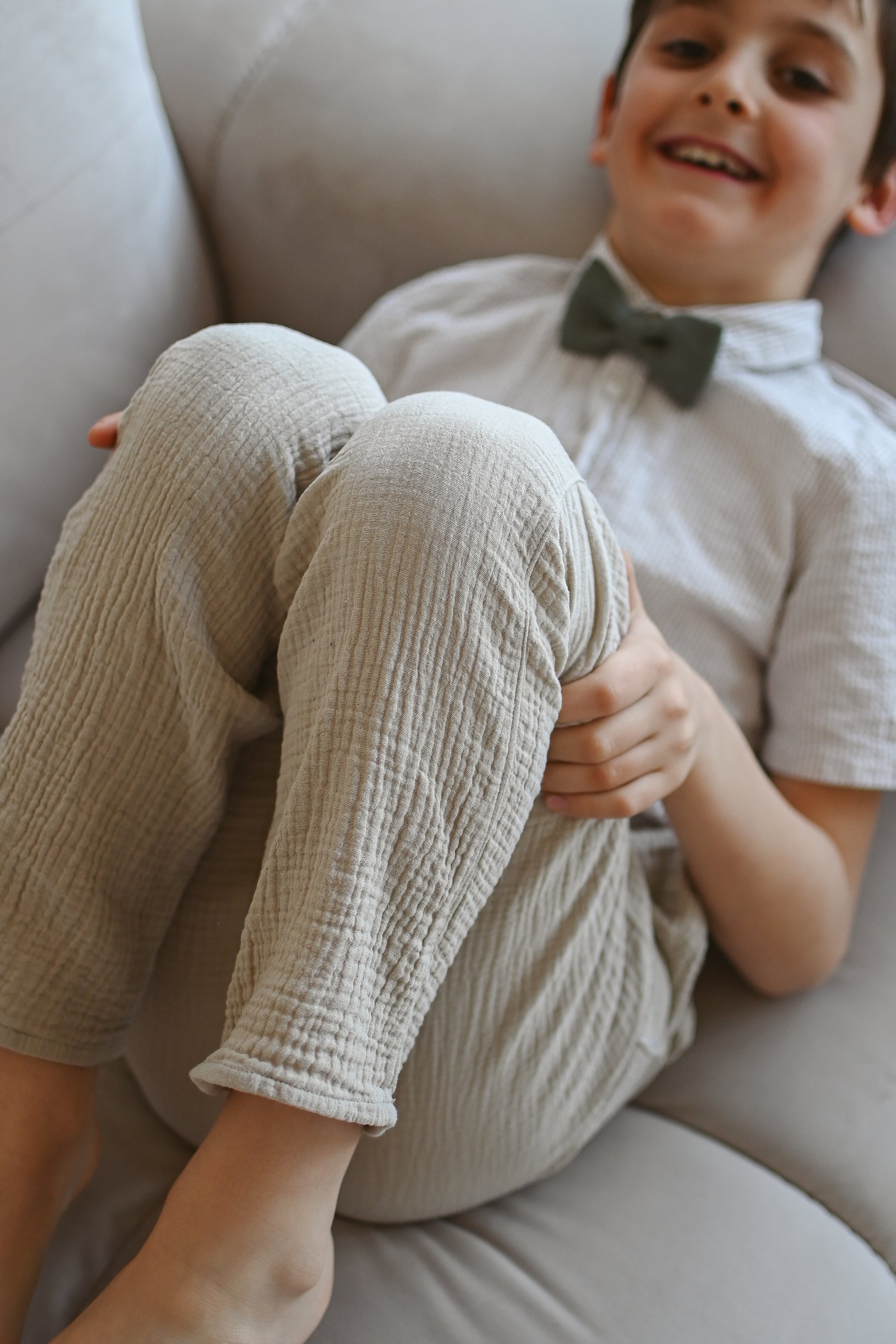 Unisex (za dečke in deklice) dolge hlače iz tetra tkanine v bež ali temno modri barvi.