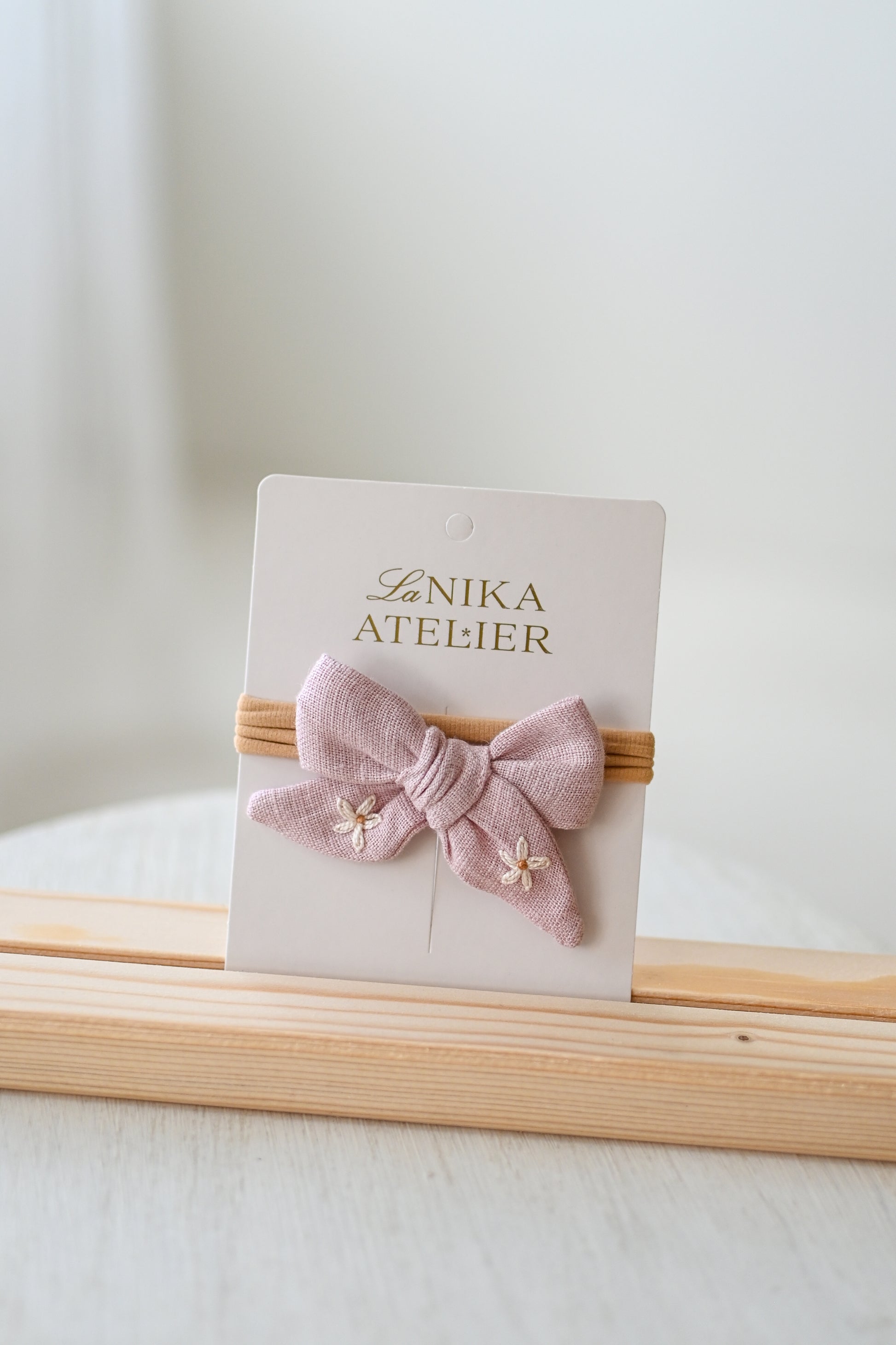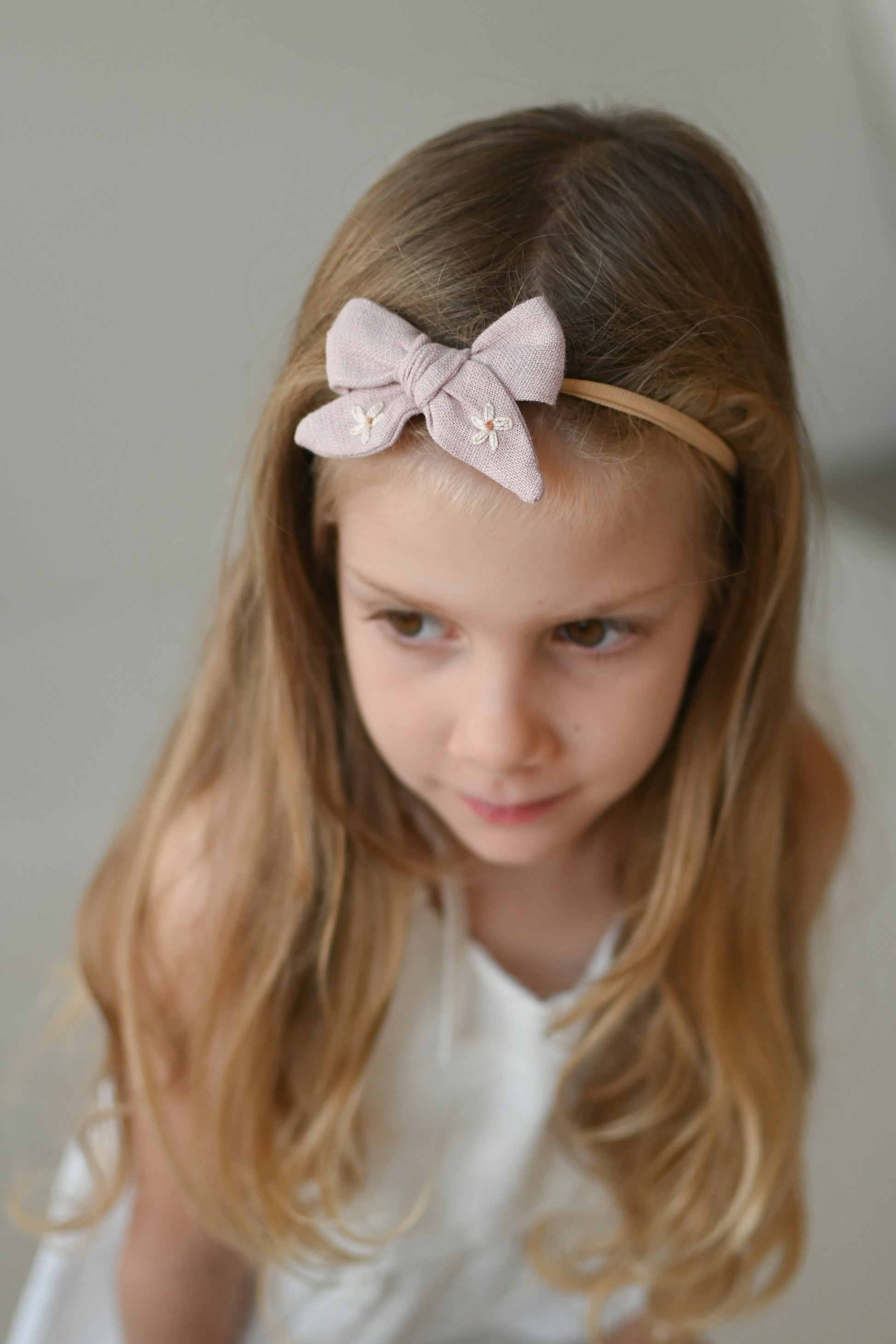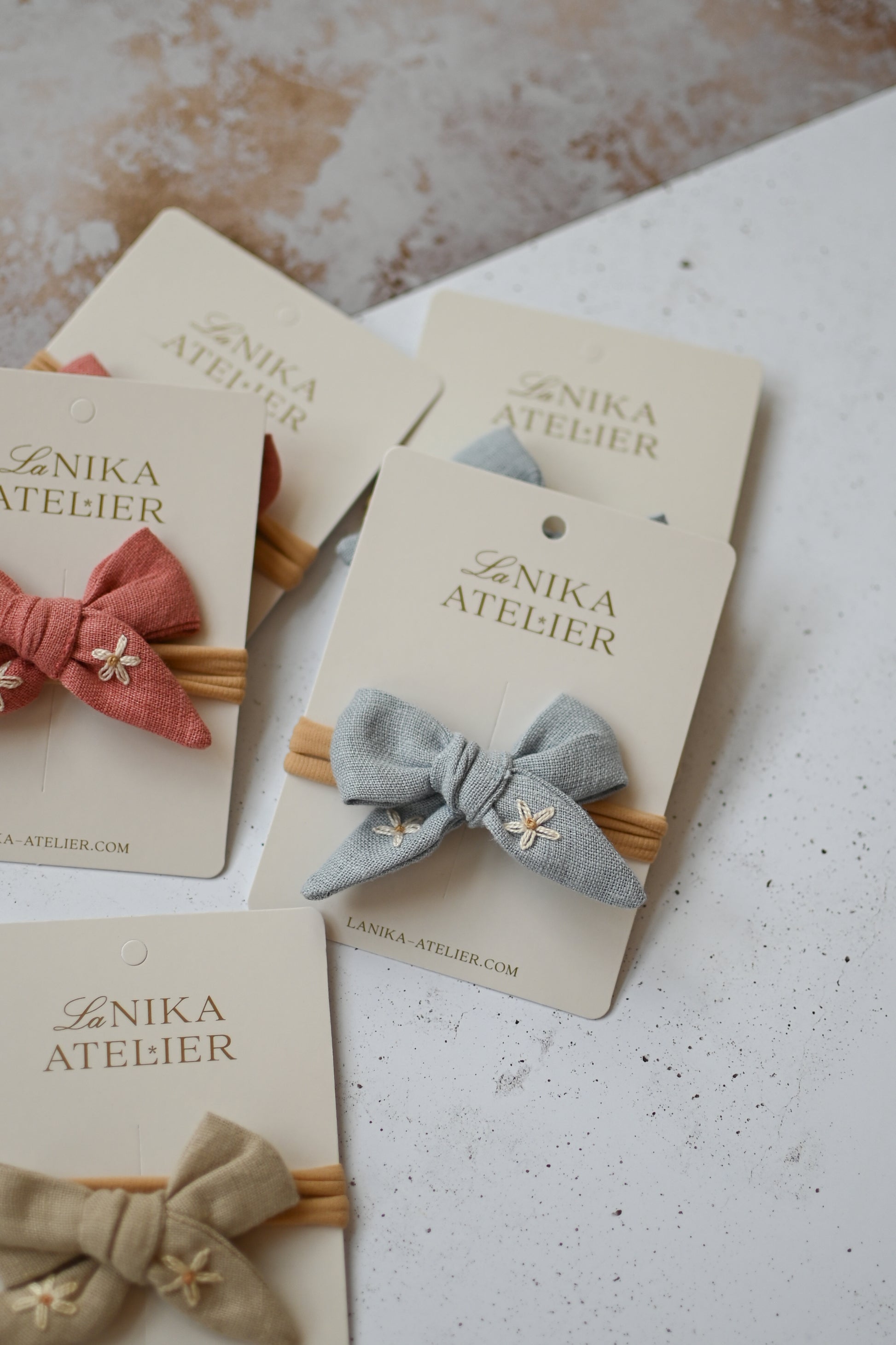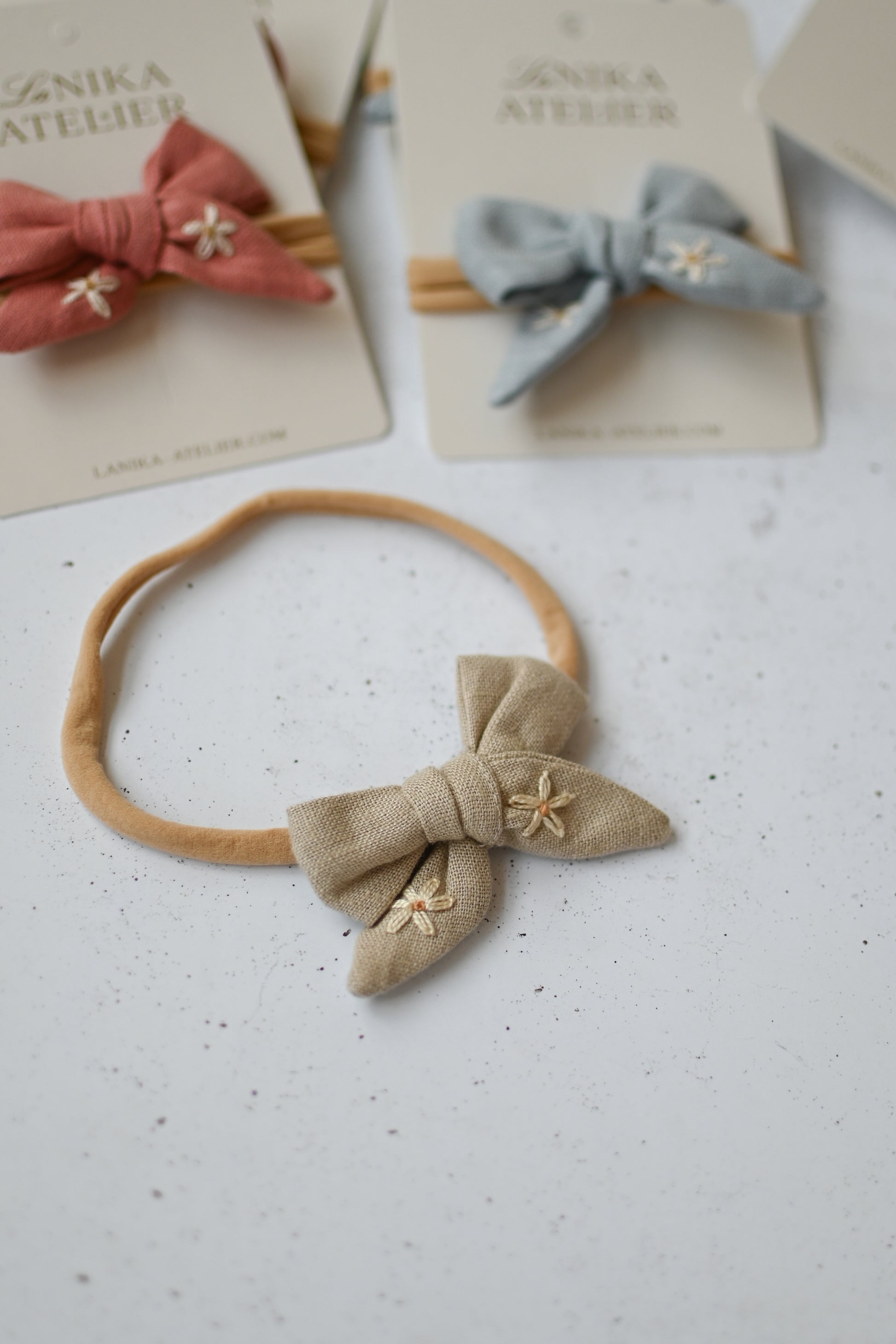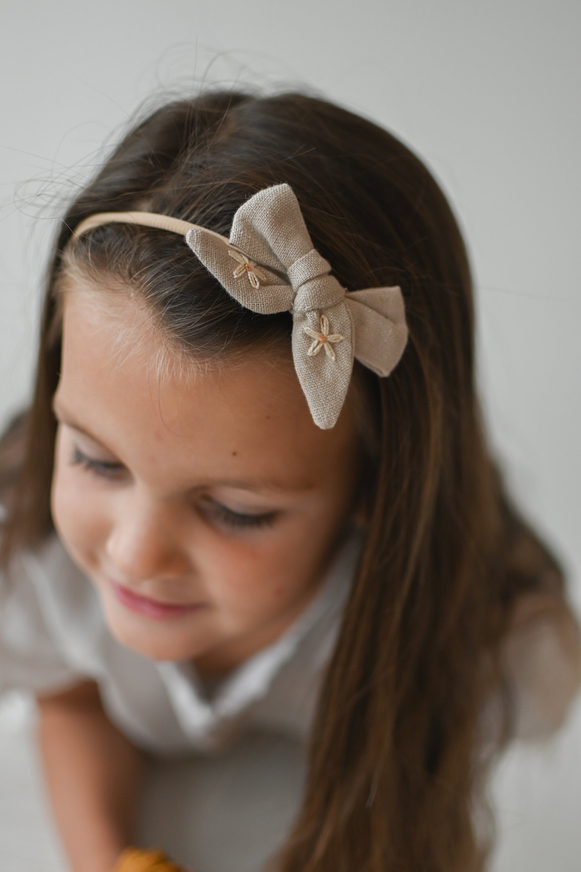 - lanena mašnica (ročno zavezana) z vezenino marjetic
