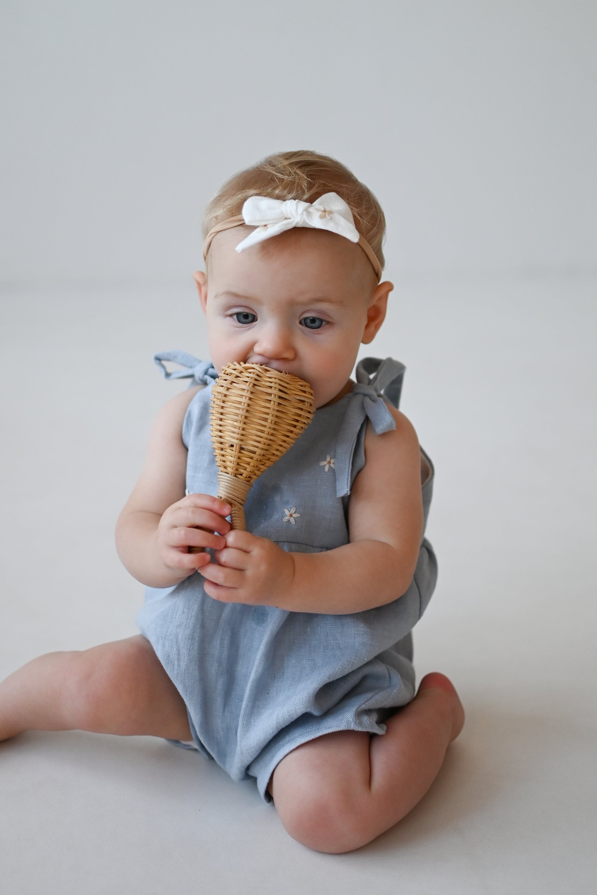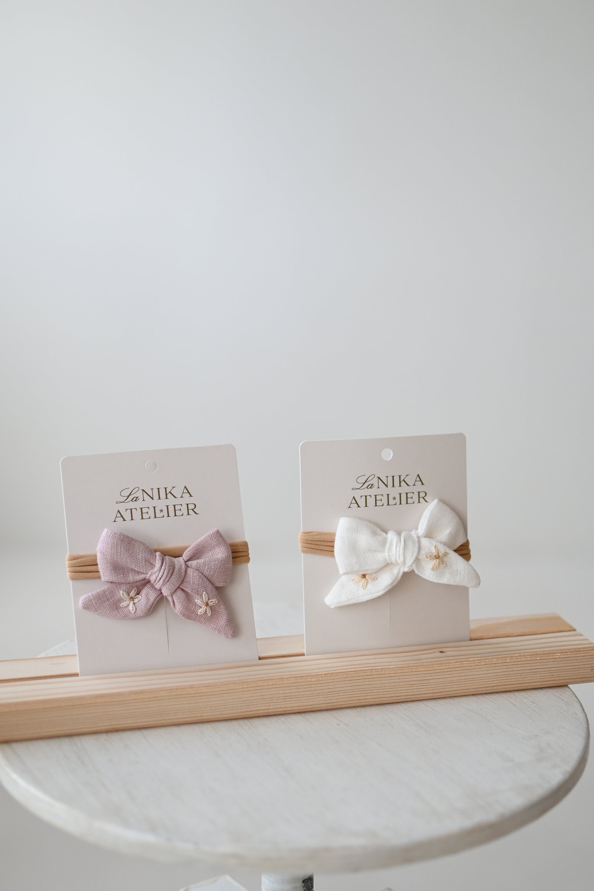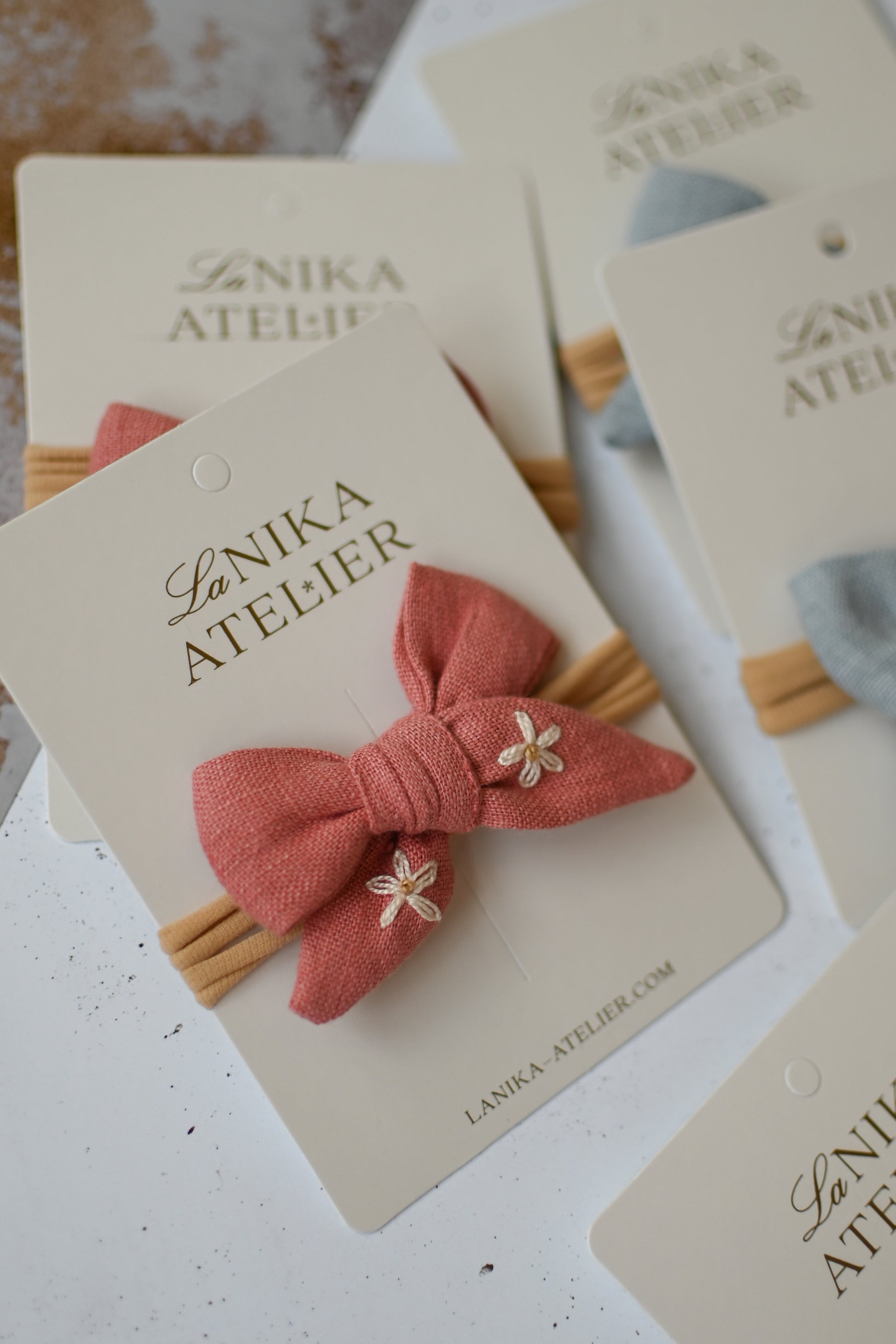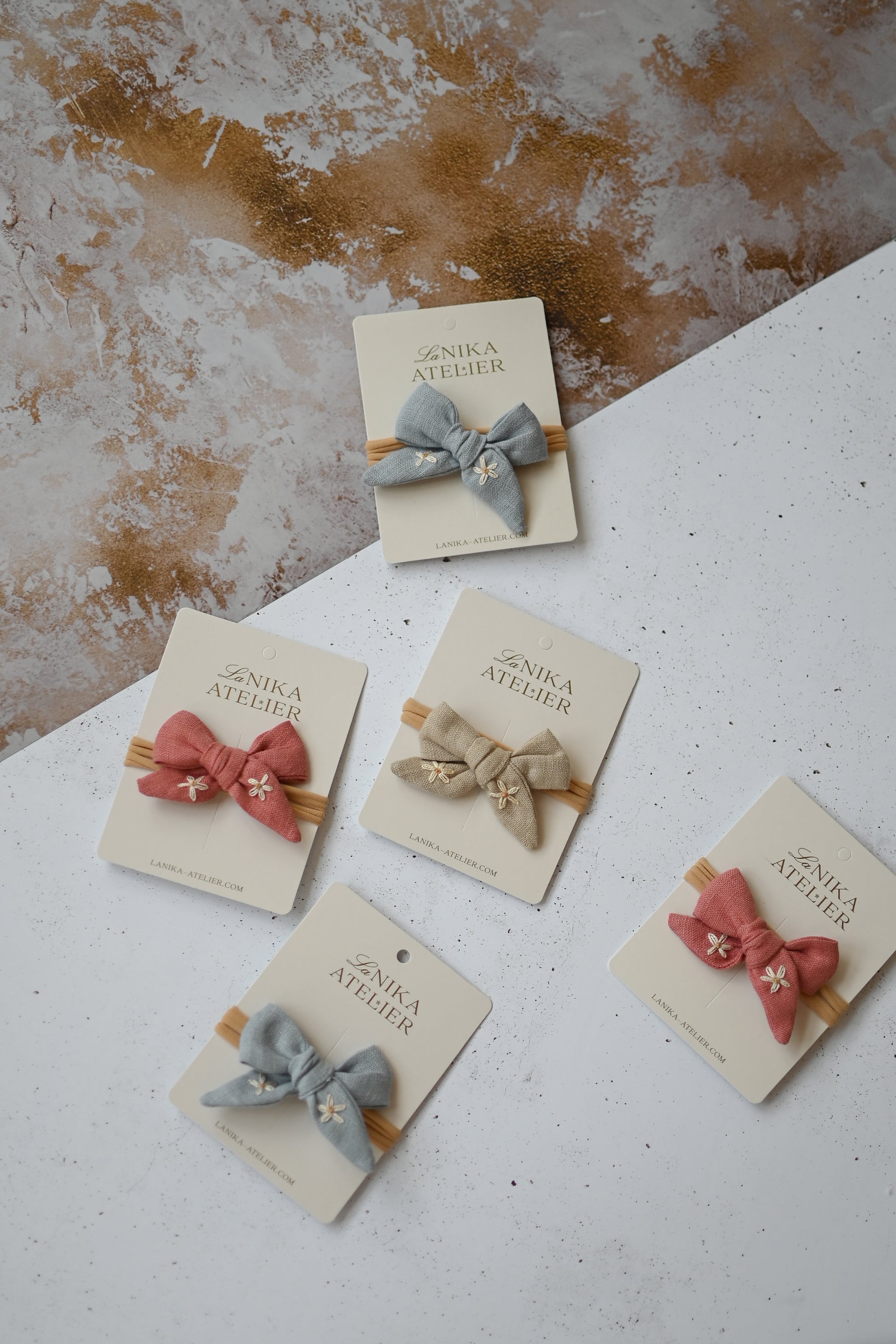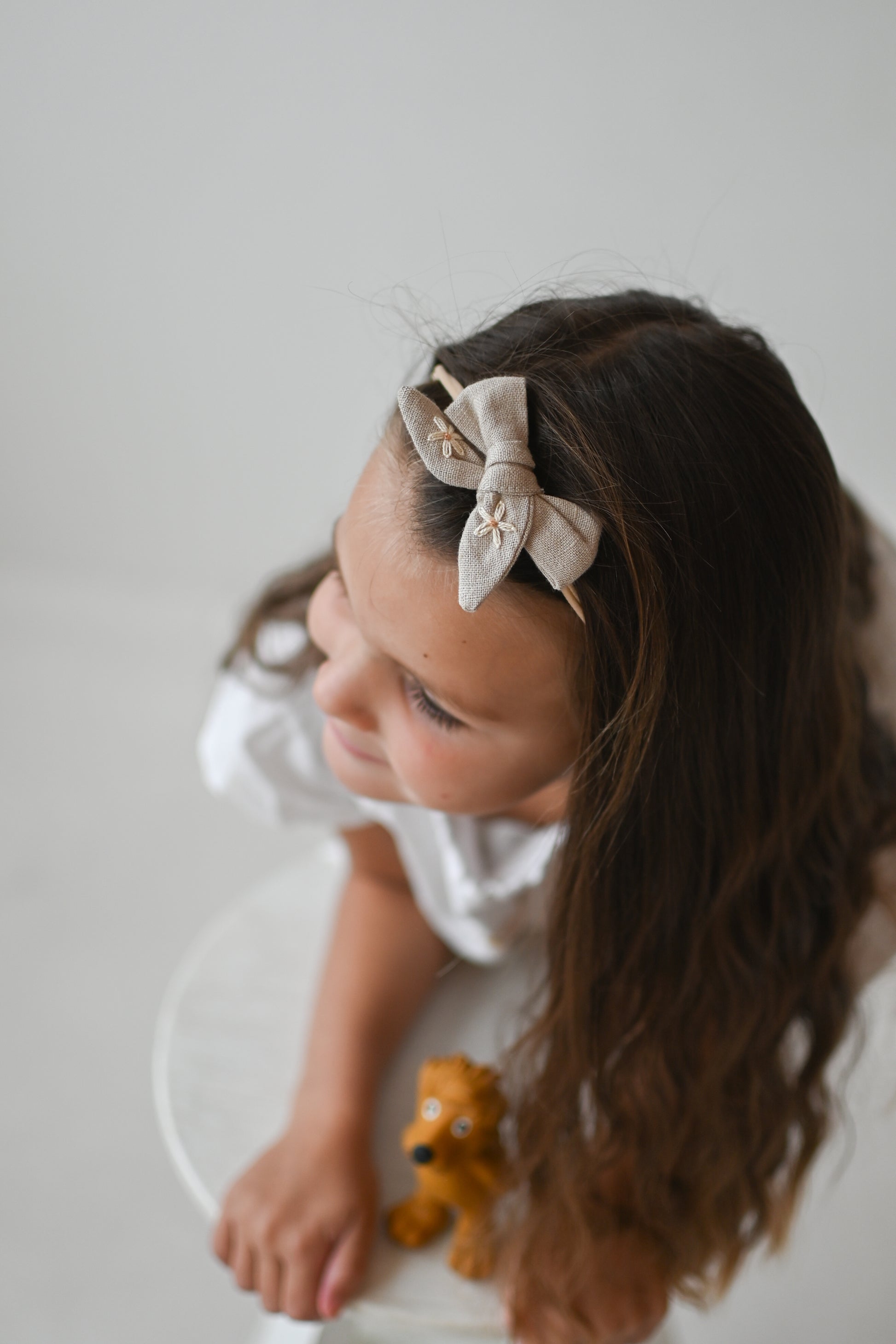 - lanena mašnica (ročno zavezana) z vezenino marjetic