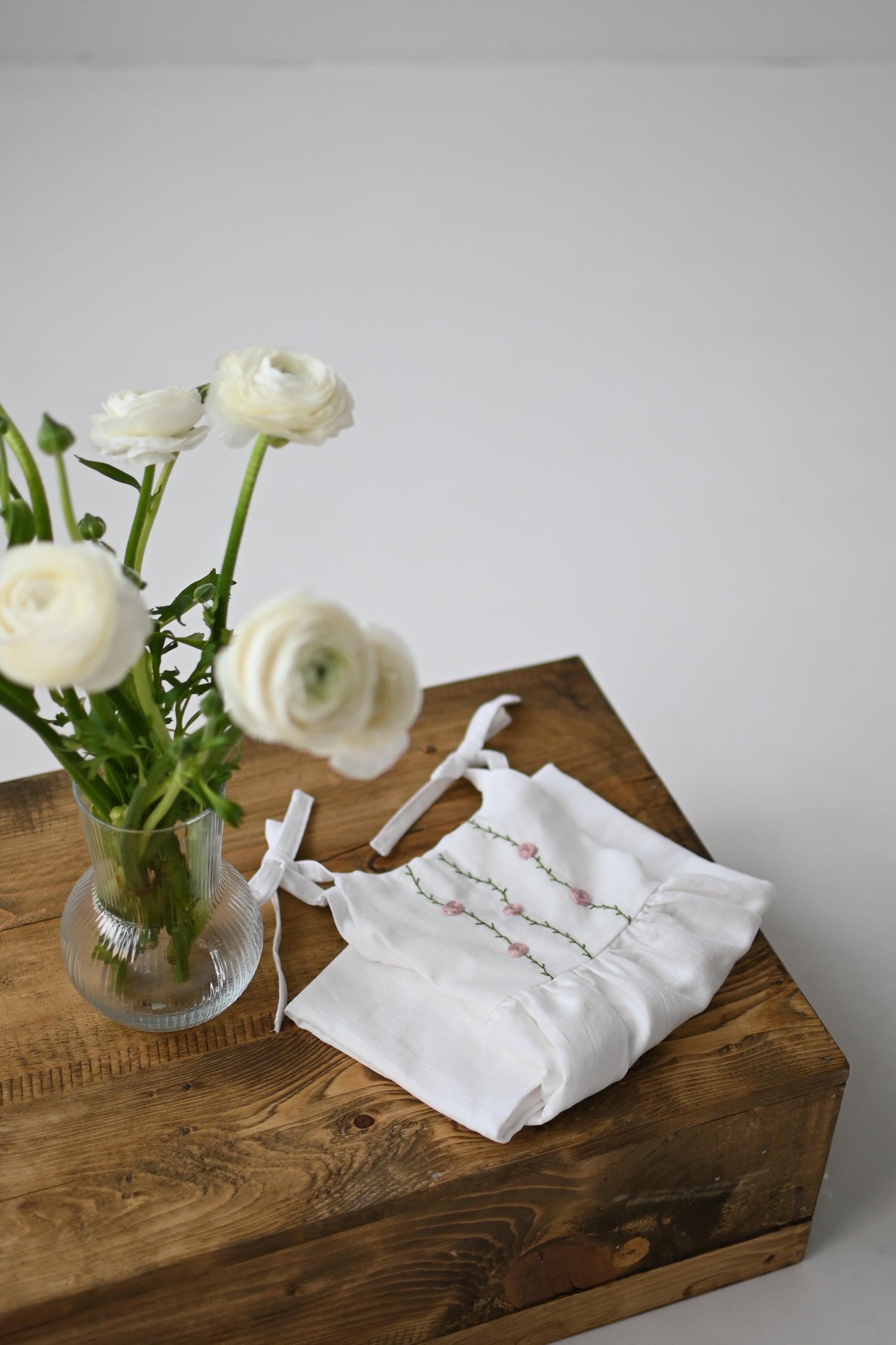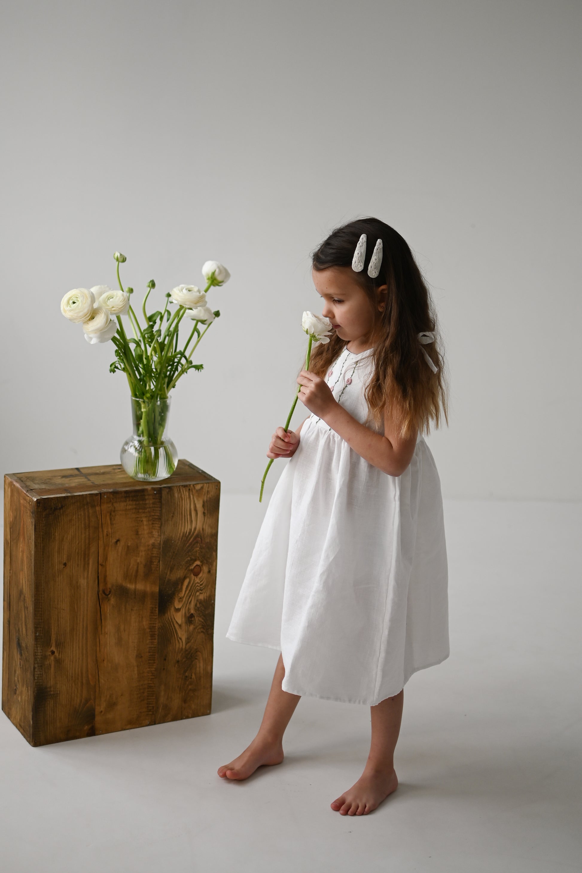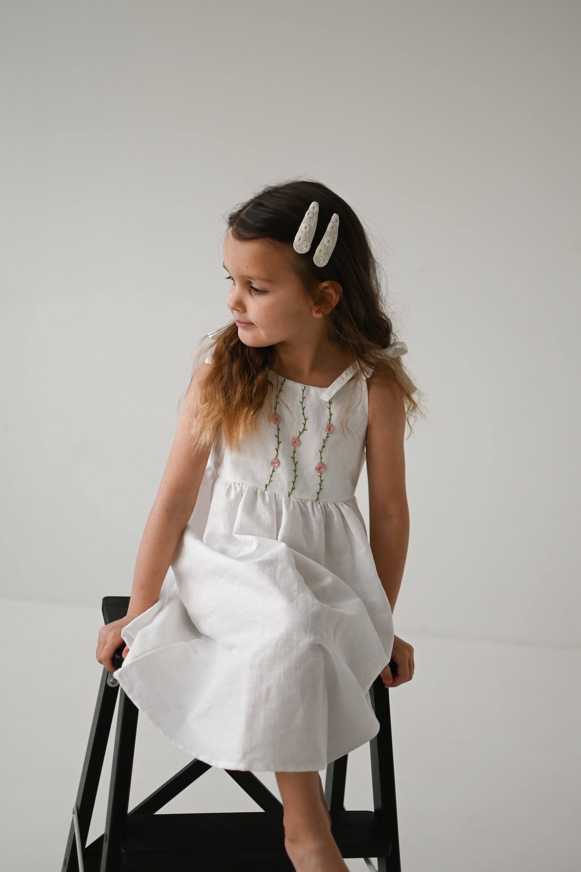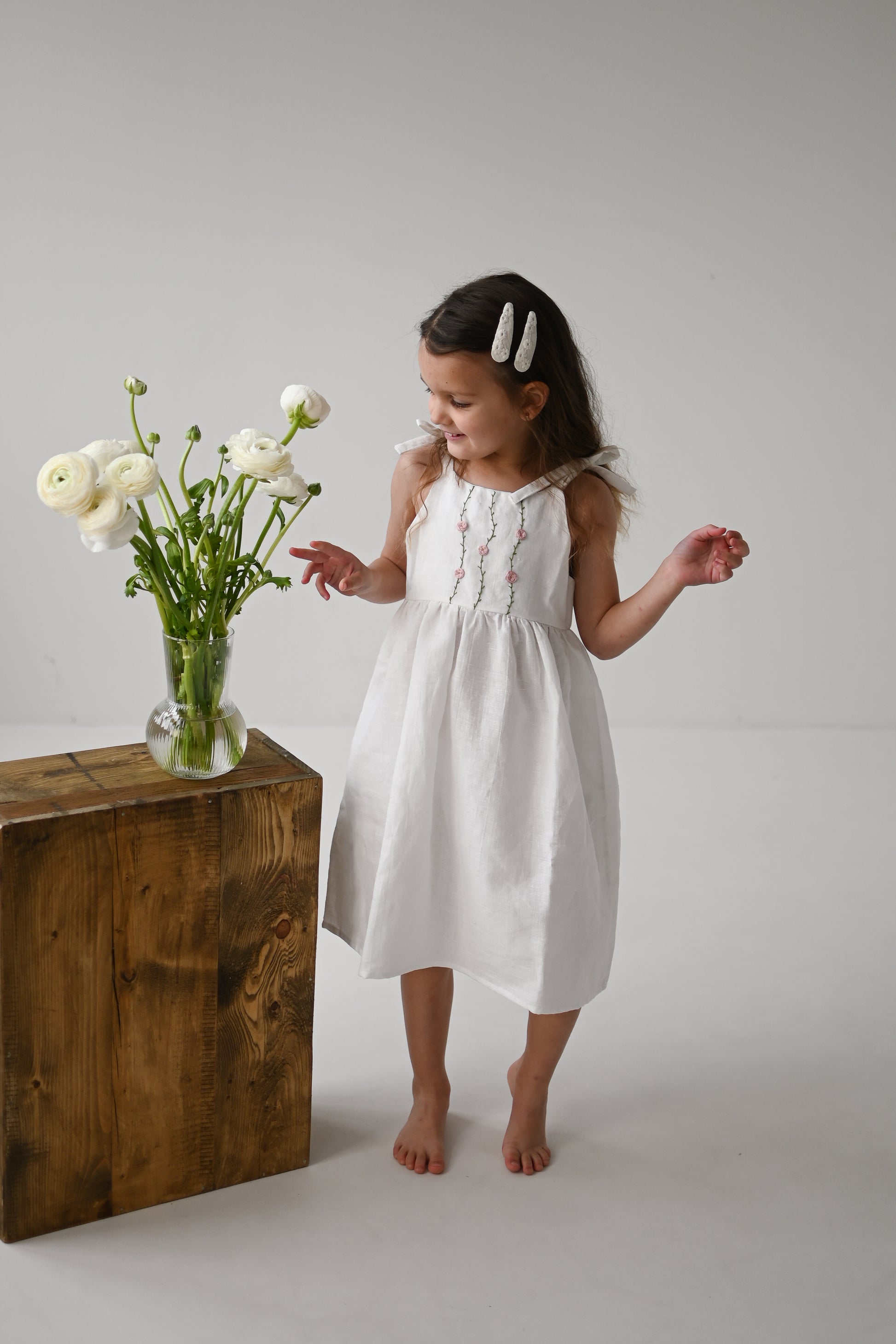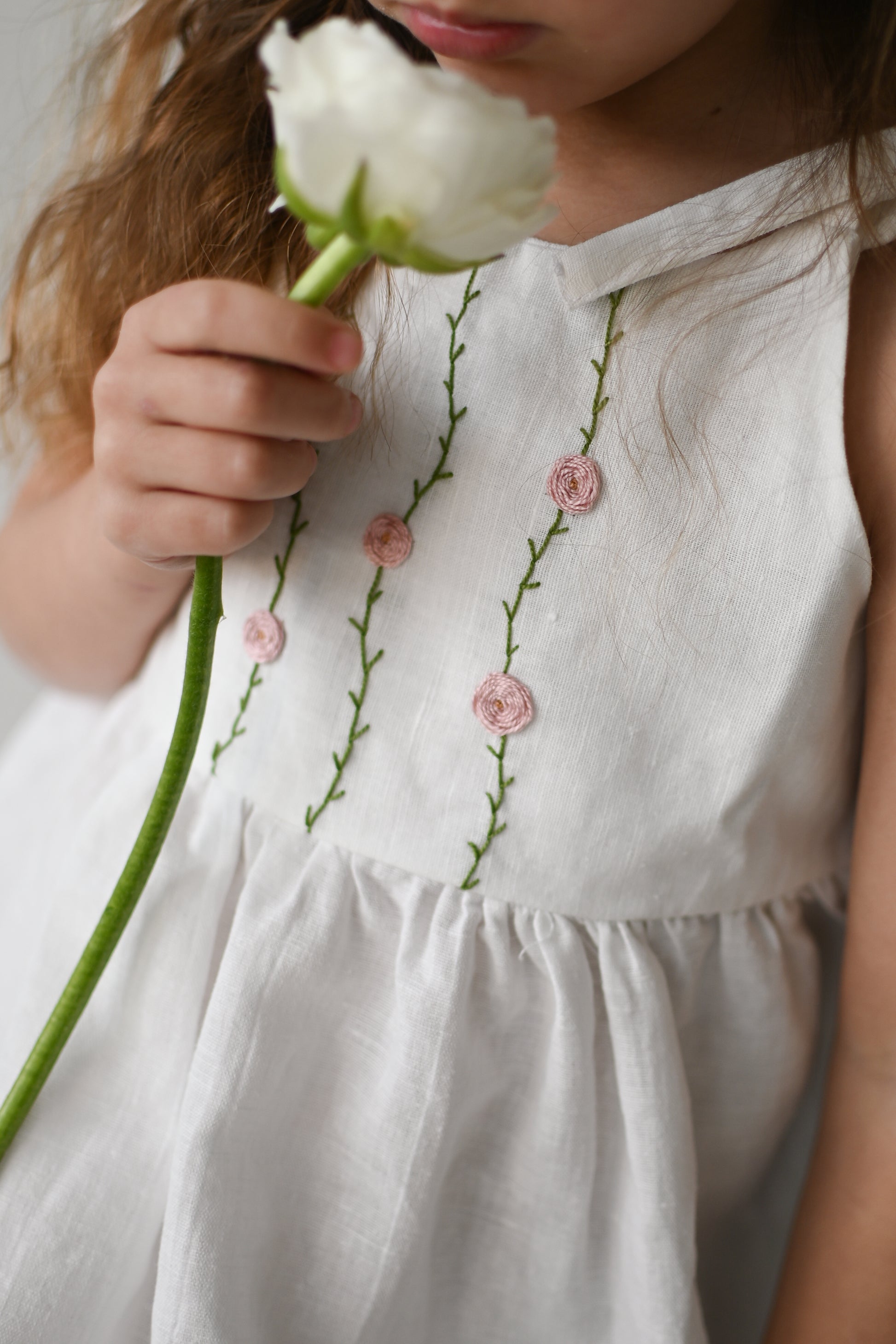 Oblekica je res mehka, saj je oblačilo predprano, da se v prihodnosti ne krči. Izdelano iz tkanine s certifikatom OEKO - TEX Standard 100. 51% lan in 49% bombaž. Vezenje je ročno izdelano in je dolgotrajen proces. Vsaka oblekica je drugačna in edinstvena. Skrbno narejena z veliko ljubezni.
