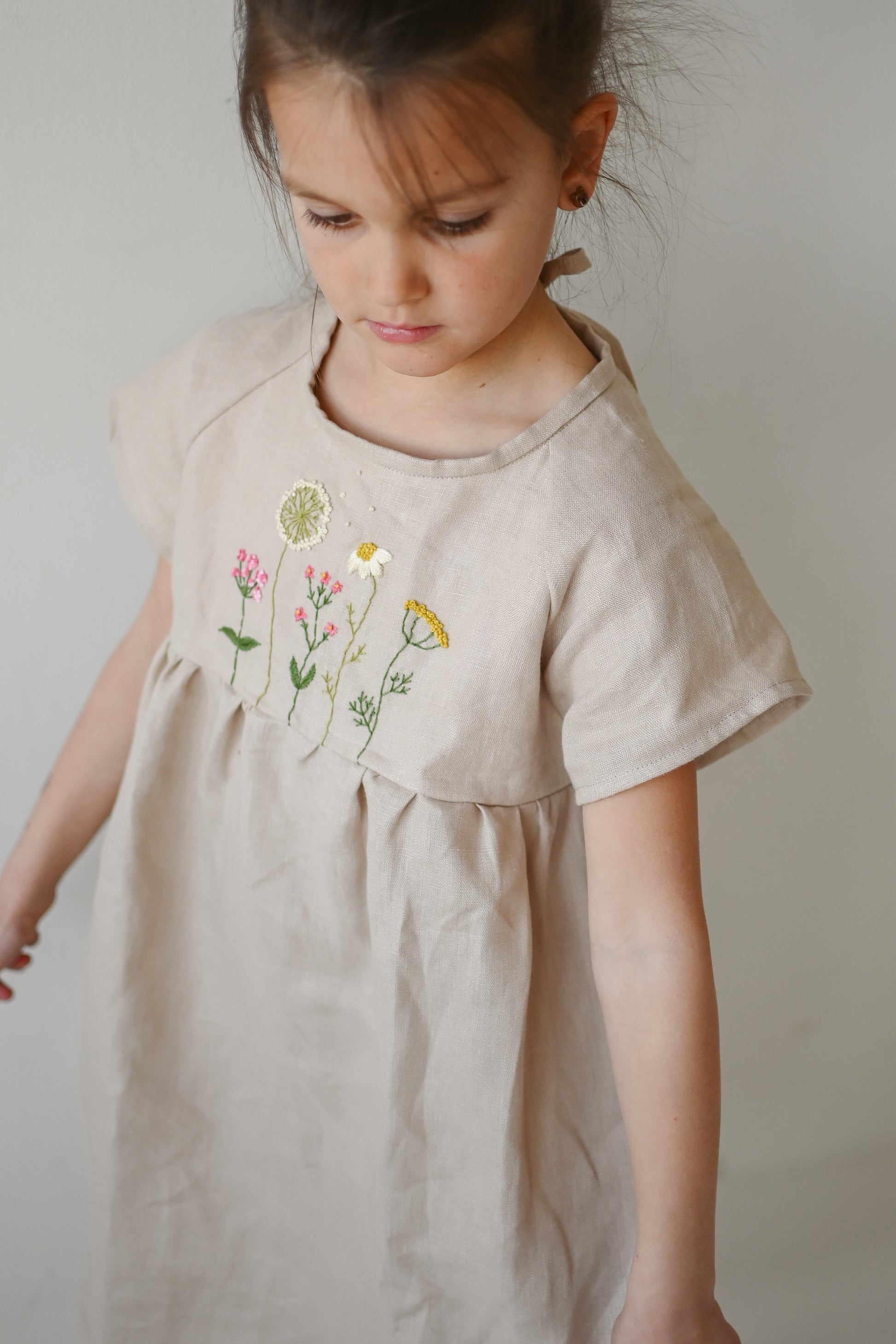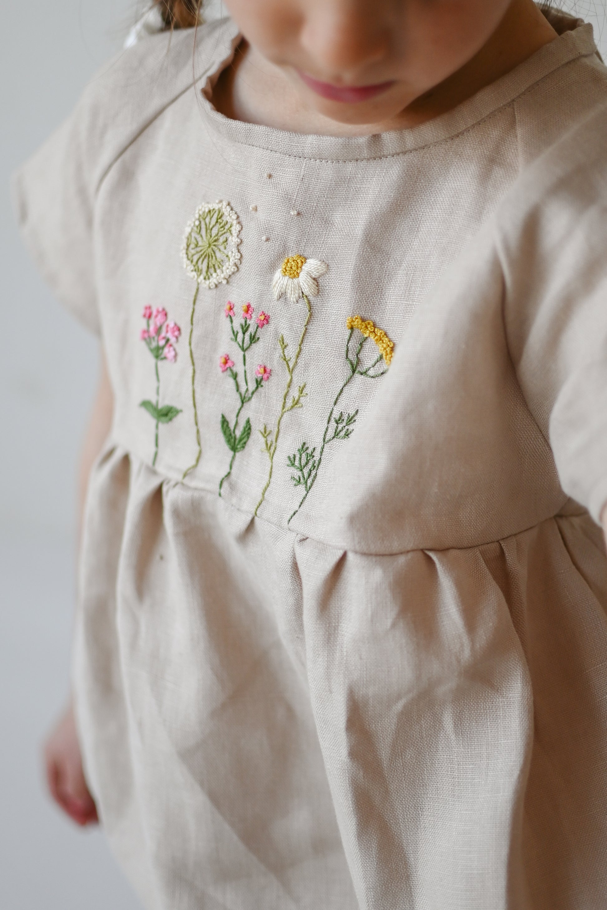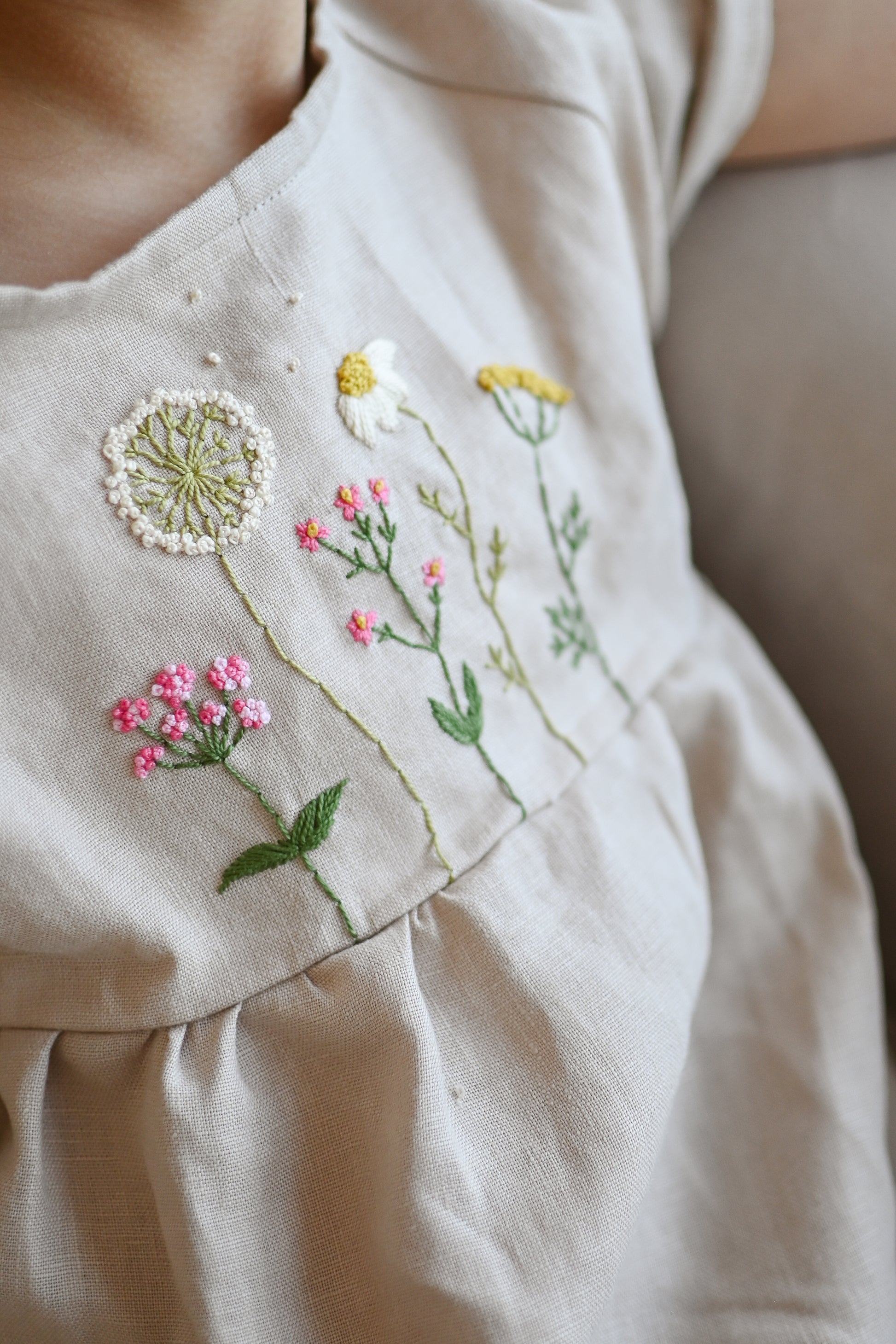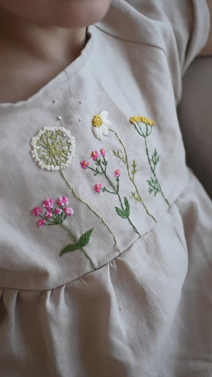 Lanene oblekica z ročno vezenimi travniškimi rožicami.