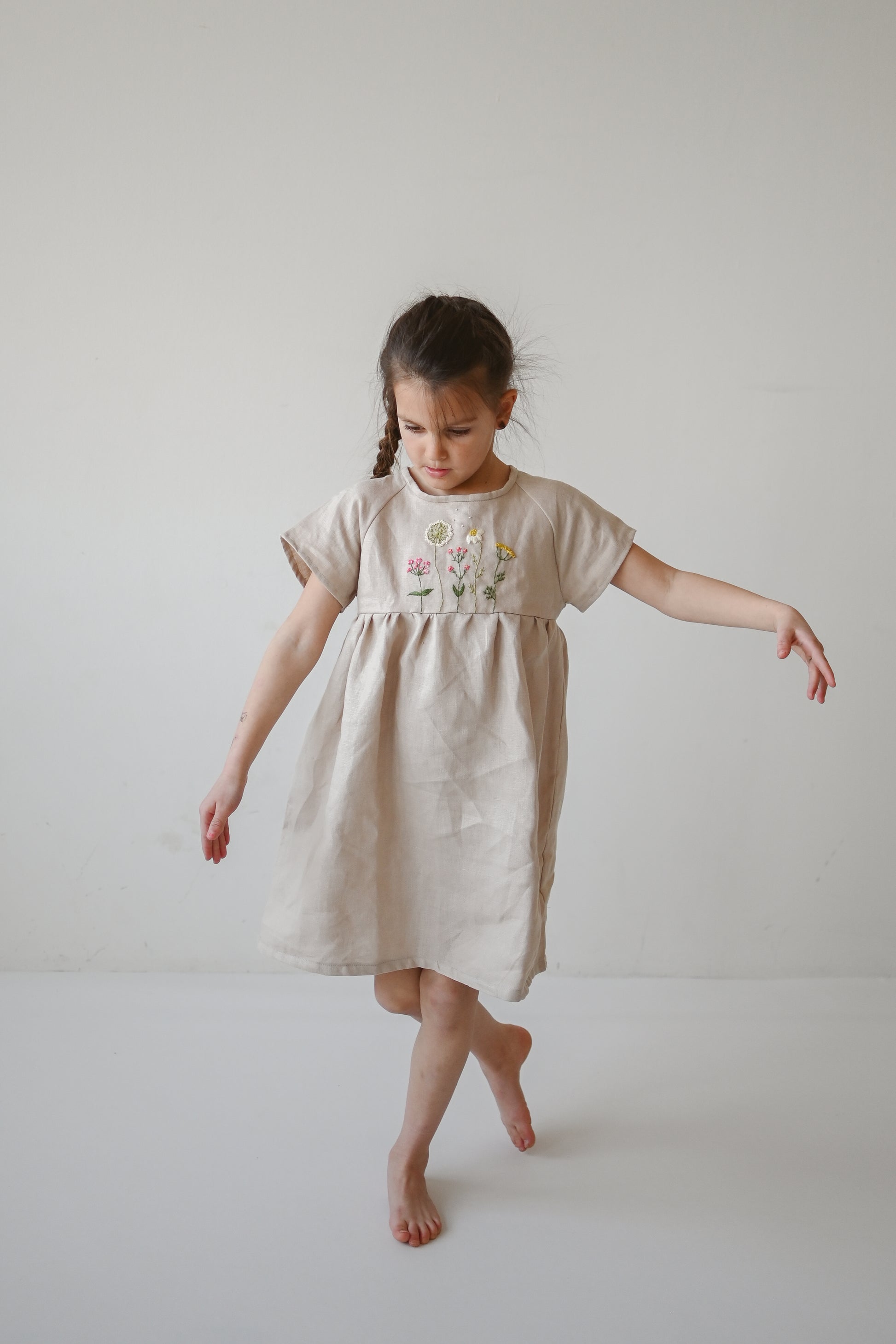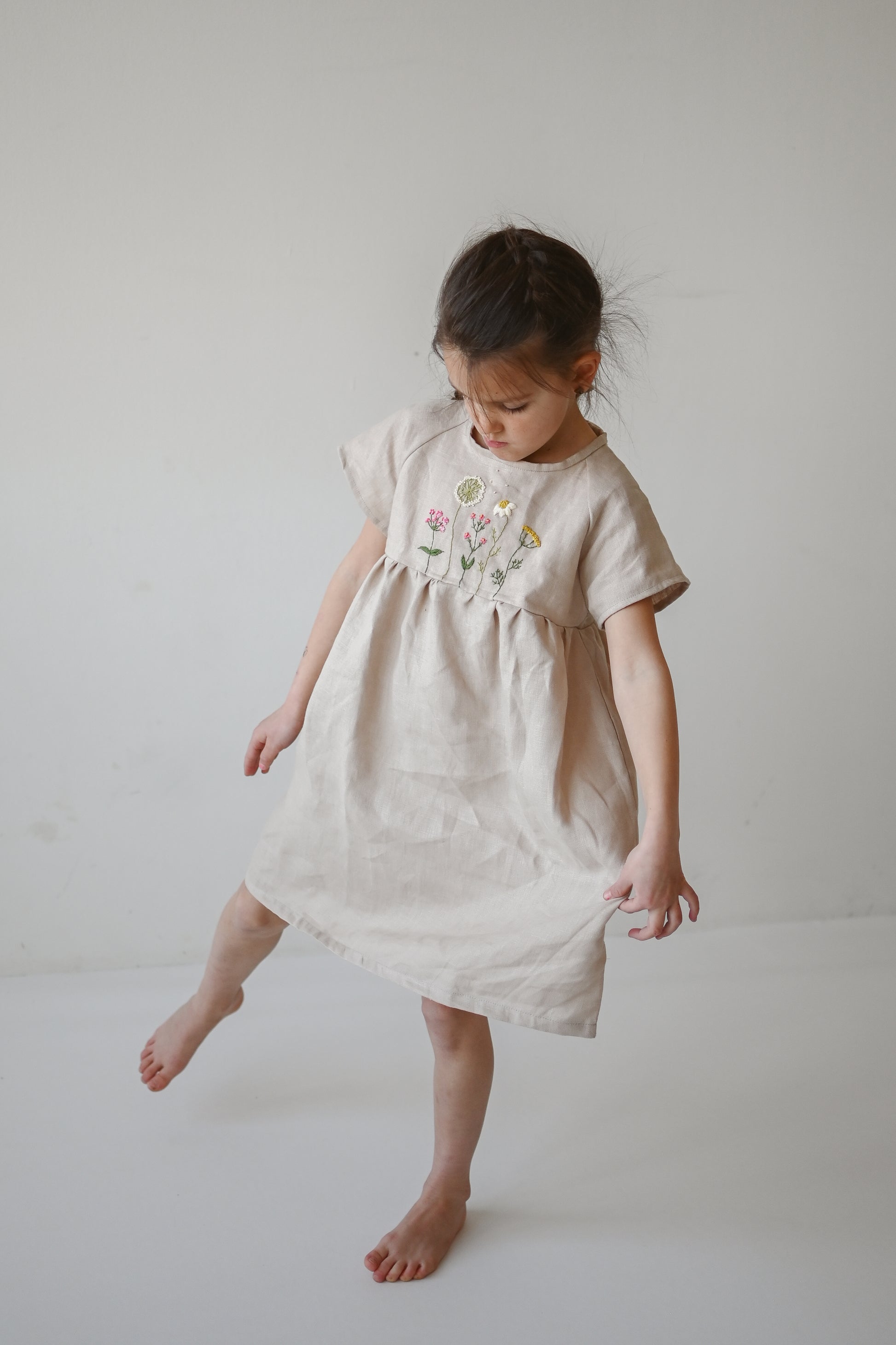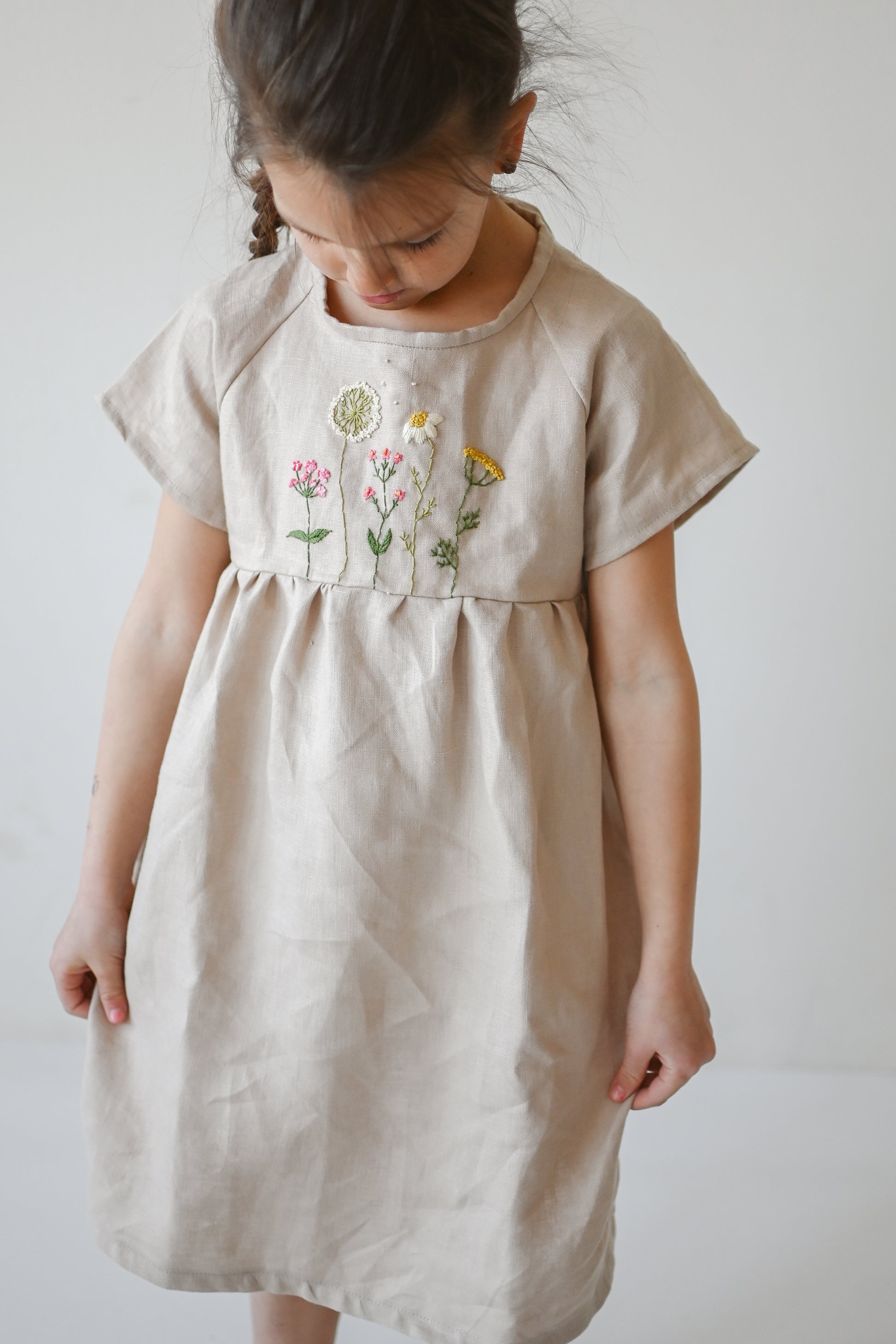 Lanene oblekica z ročno vezenimi travniškimi rožicami.
