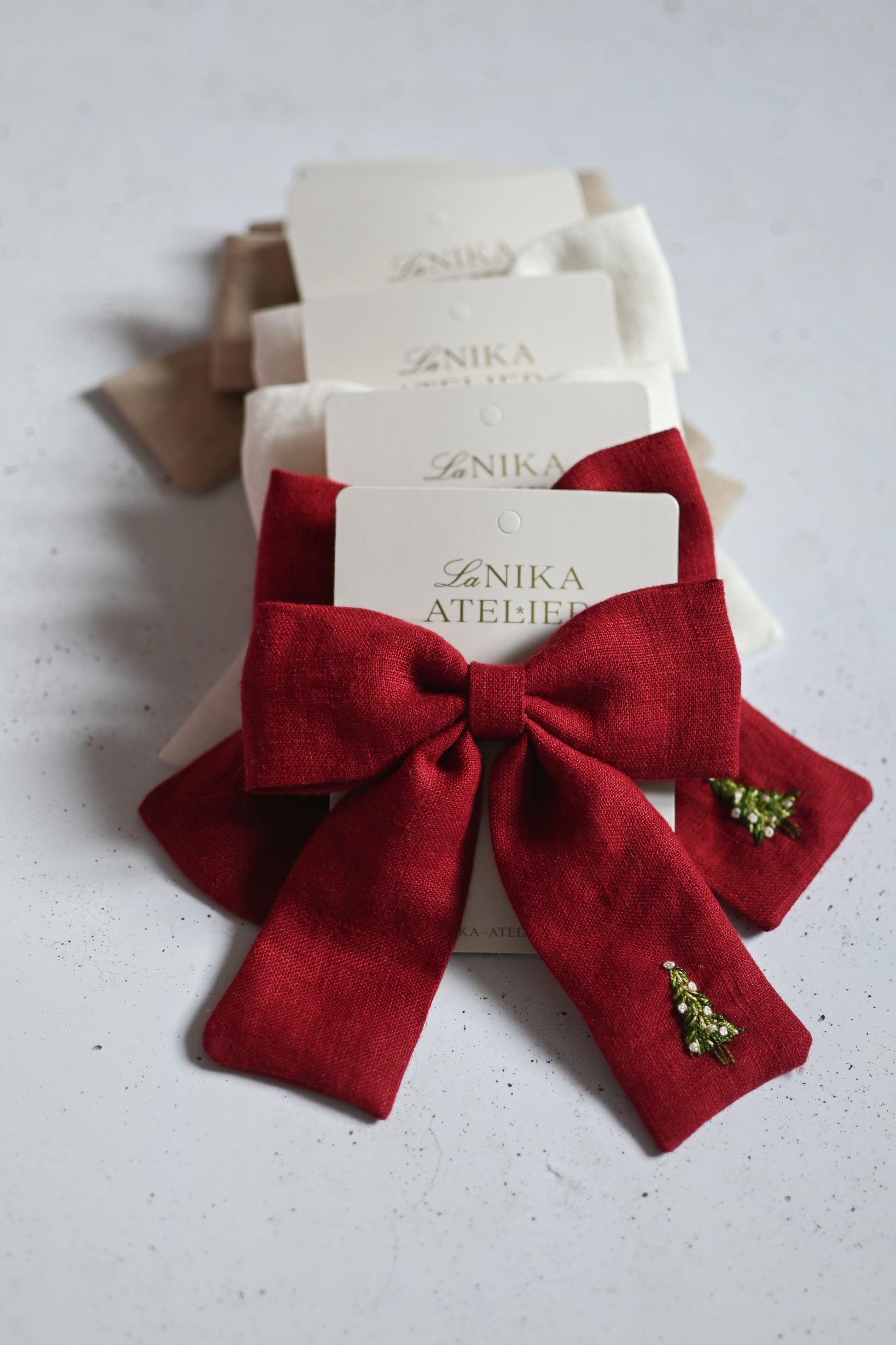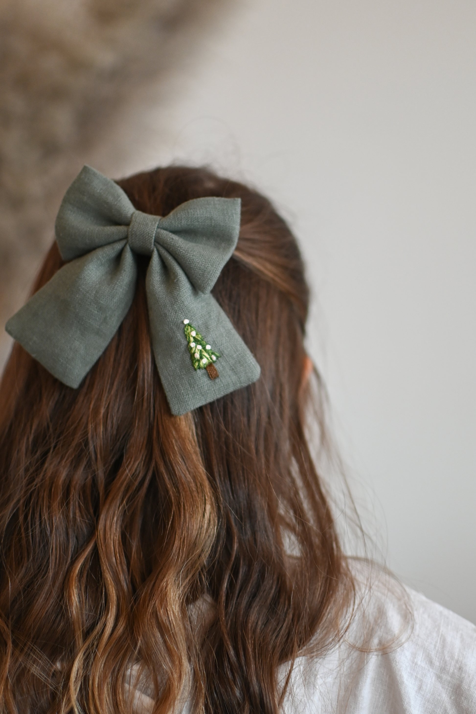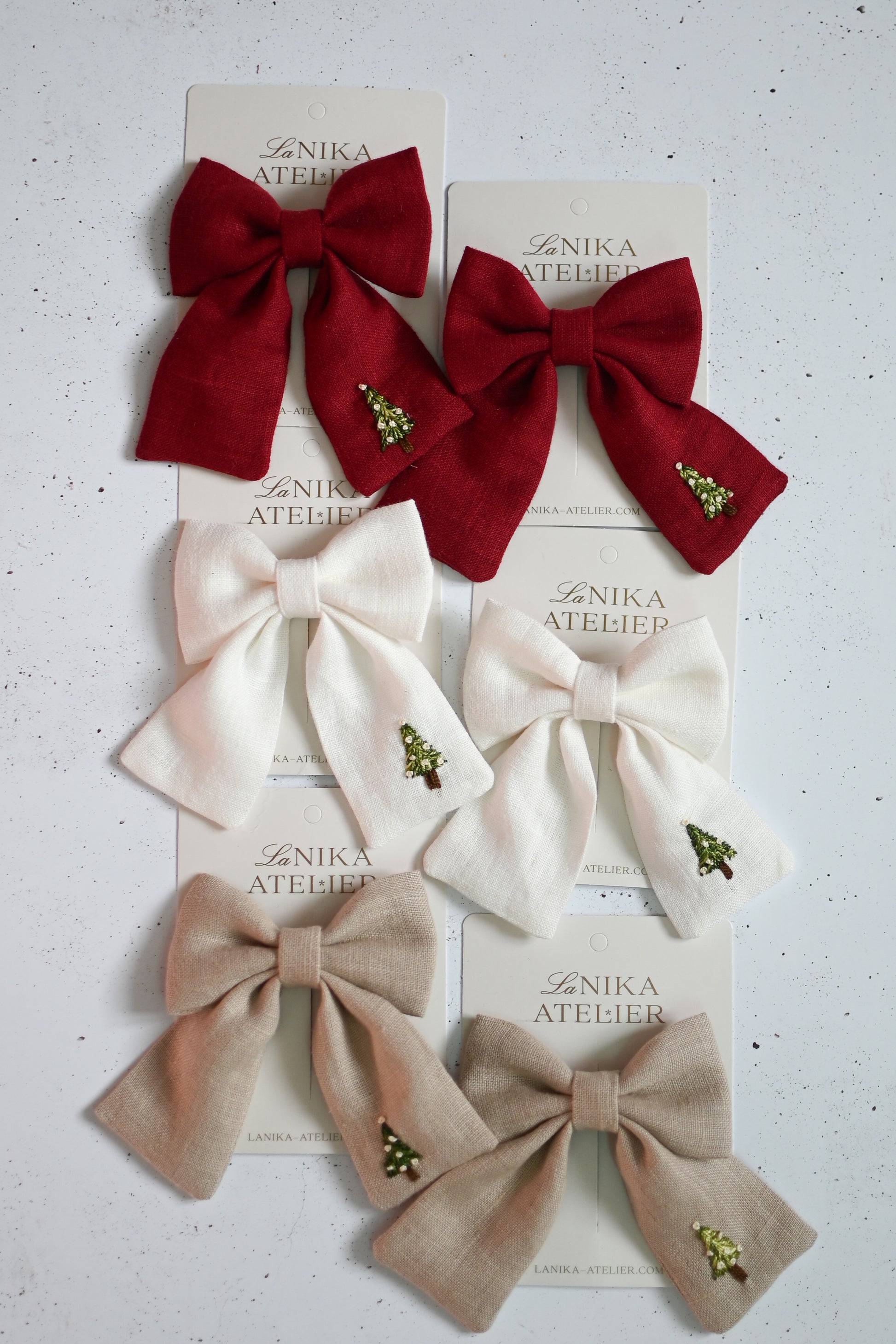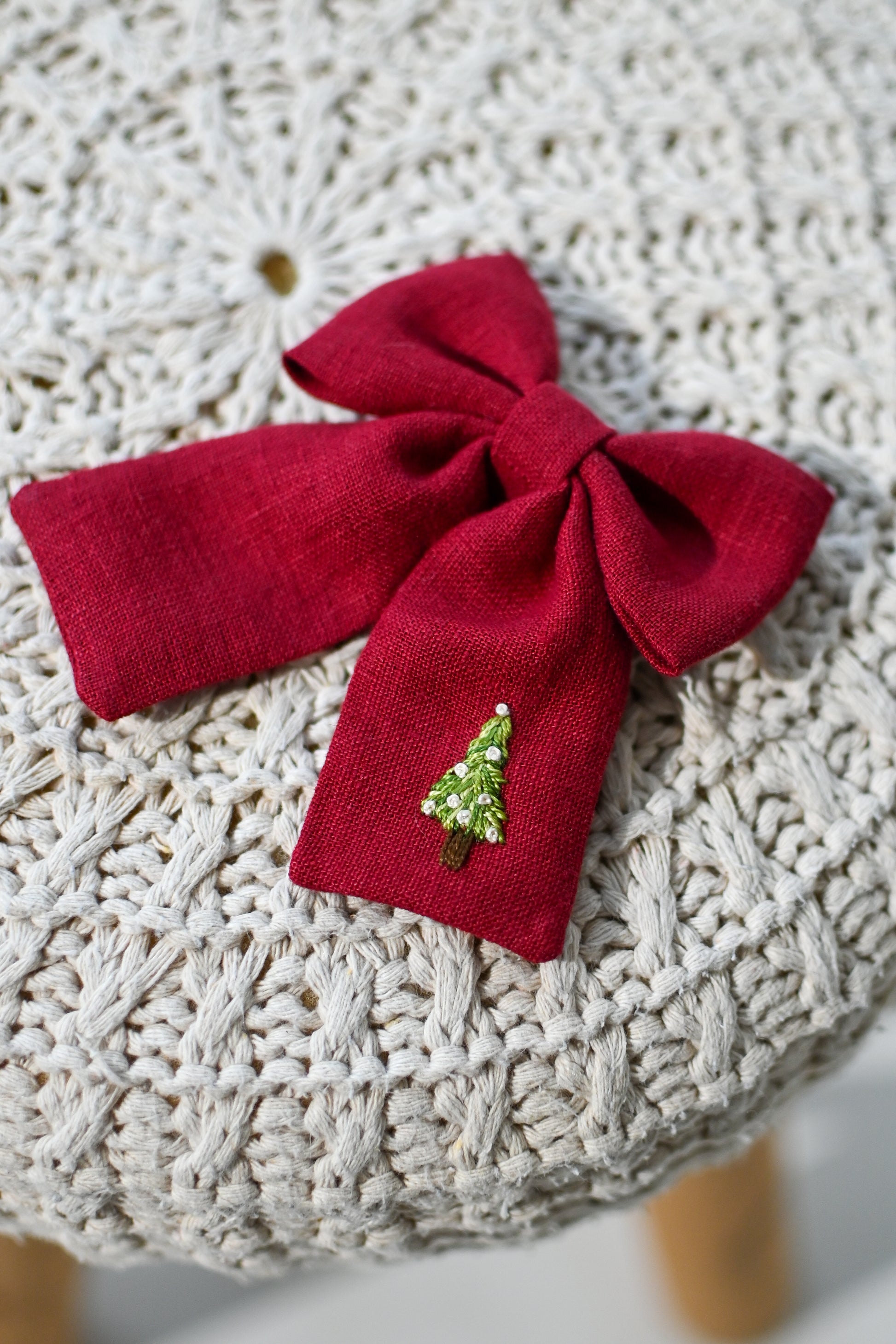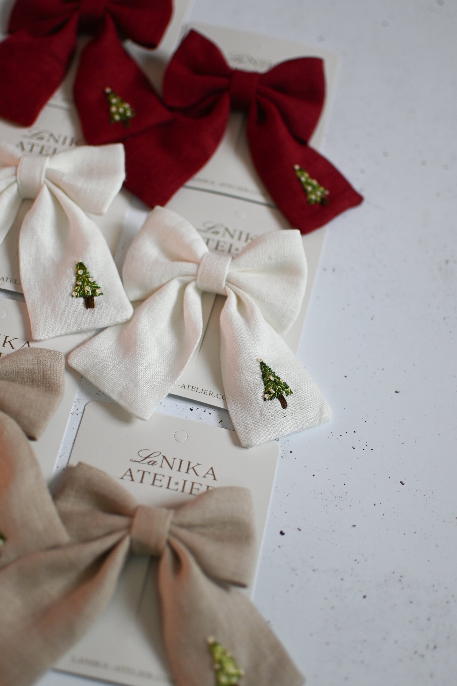Ročno izdelane Midi and Large lanene mašnice za lase z ročno vezenino božične smrečice.