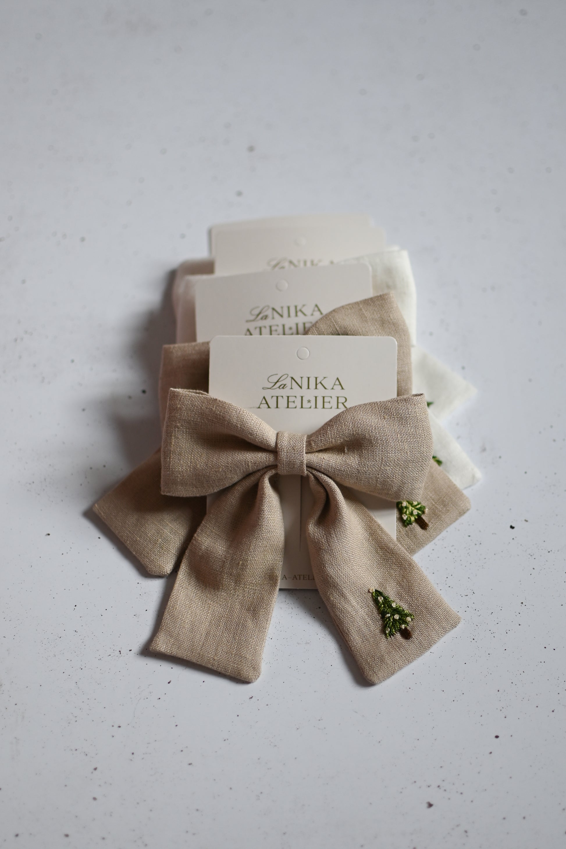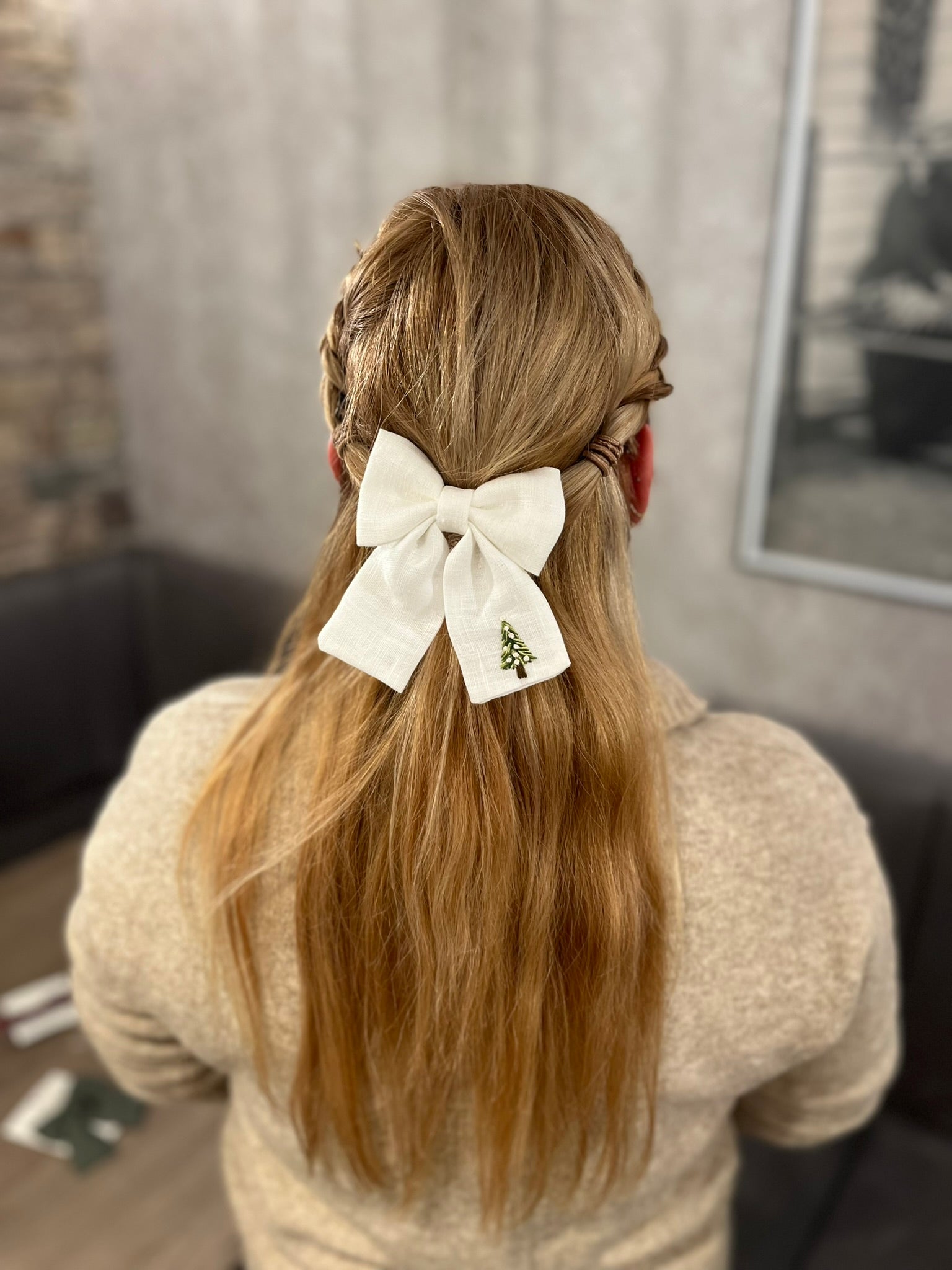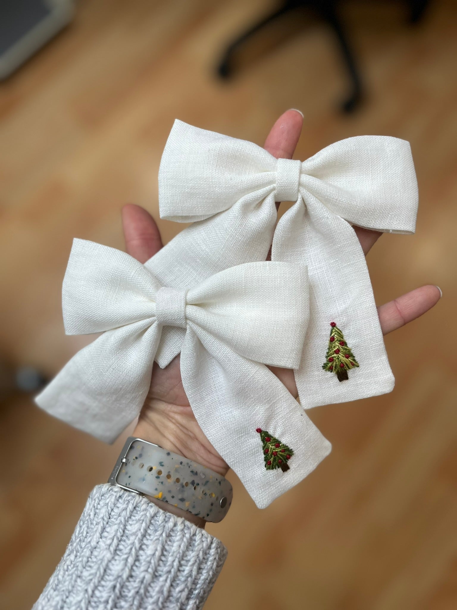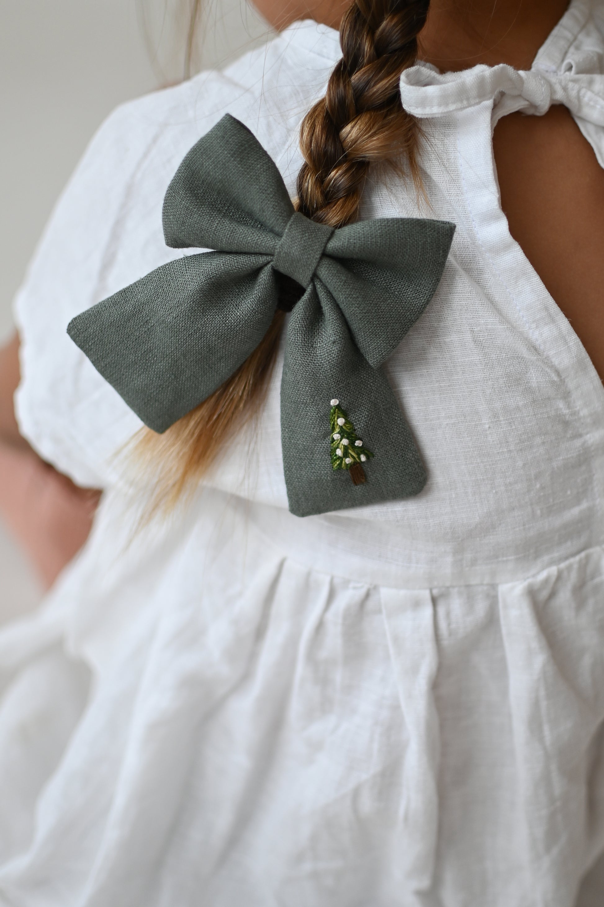 Ročno izdelane Midi and Large lanene mašnice za lase z ročno vezenino božične smrečice.