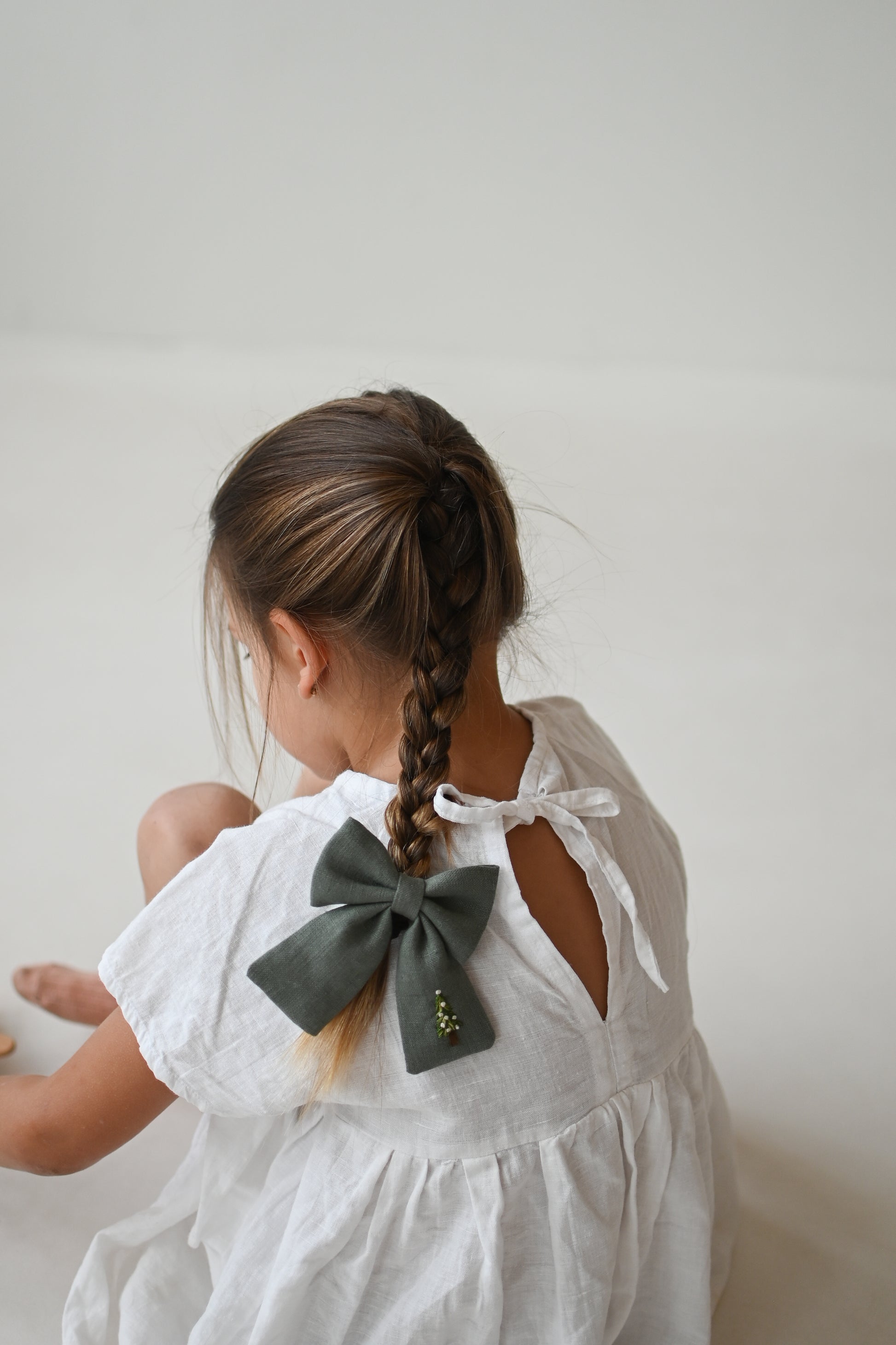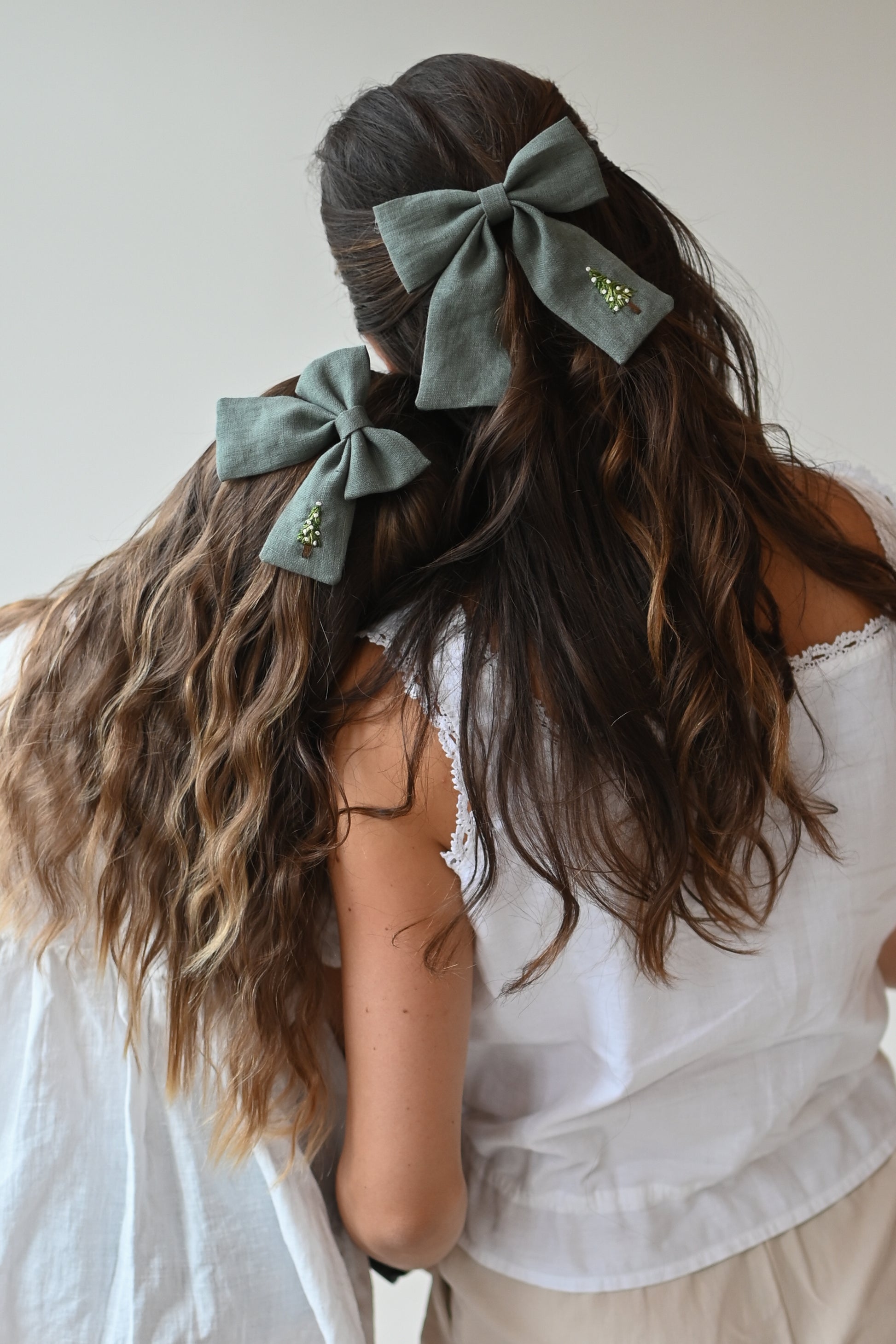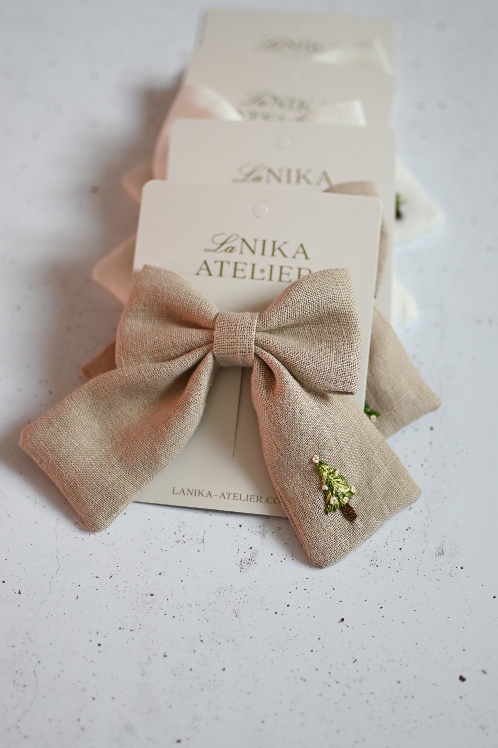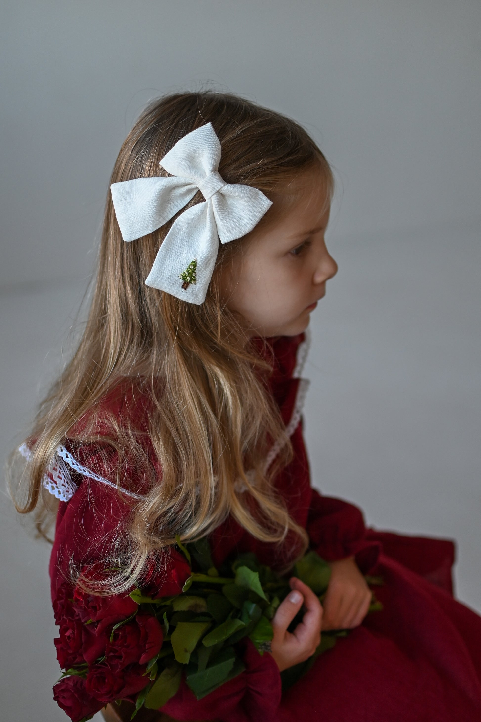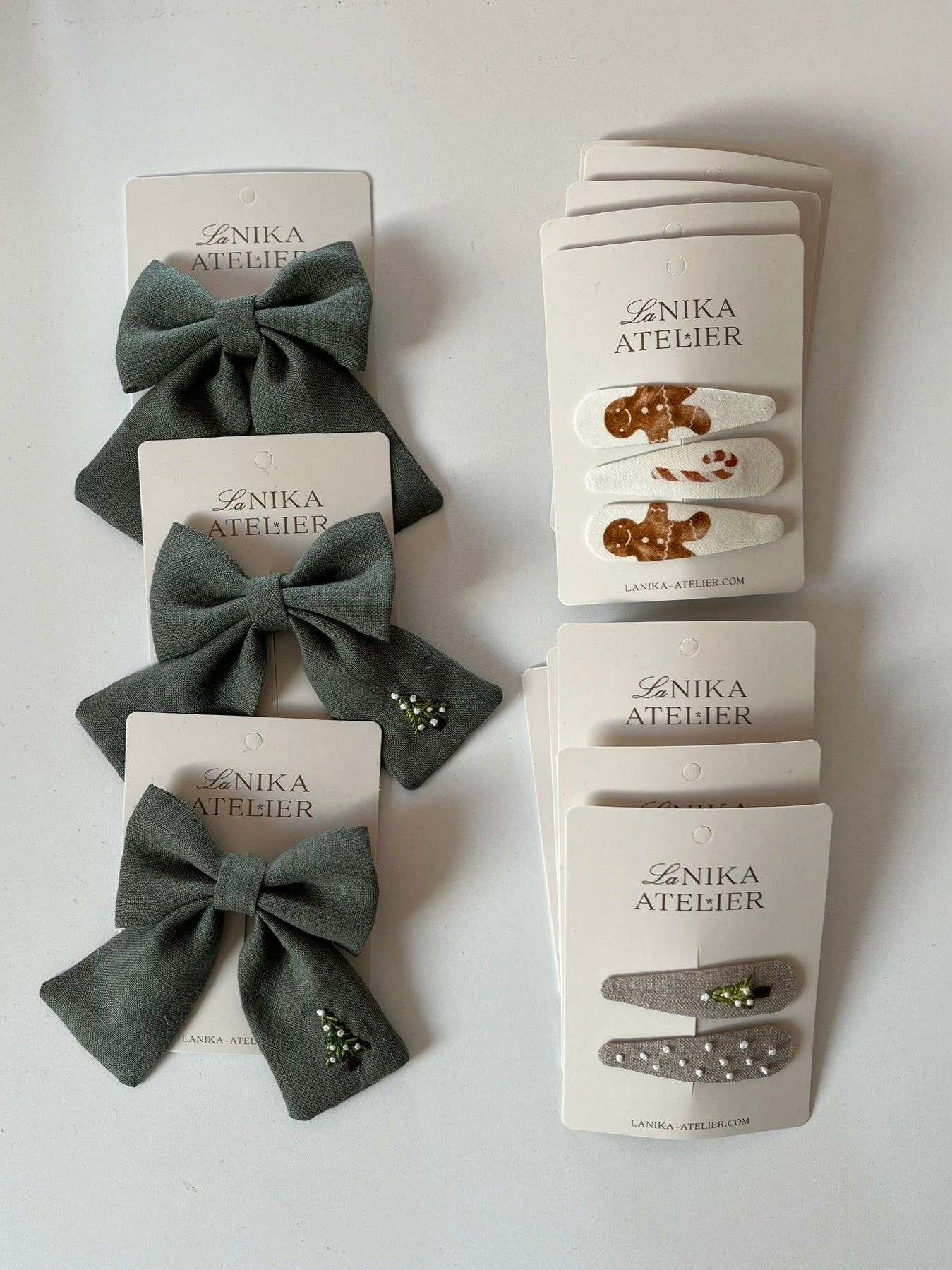 Ročno izdelane Midi and Large lanene mašnice za lase z ročno vezenino božične smrečice.
